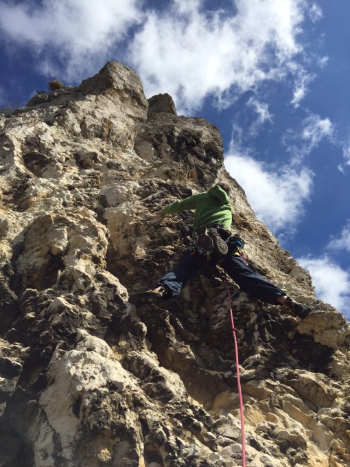 Die 5b Länge ist dann deutlich anspruchsvoller. Nach einer soliden Sanduhr steckt noch ein zweifelhafter Schlaghaken, danach nichts mehr bis zum Stand. Einige kleine Friends helfen.