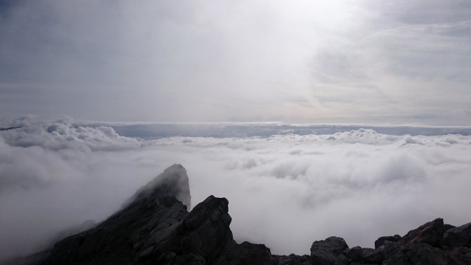 Den ganzen Tag viele Wolken und nur selten Sonne und Aussicht, auf dem Gipfel kalter Wind aus Sektor S.