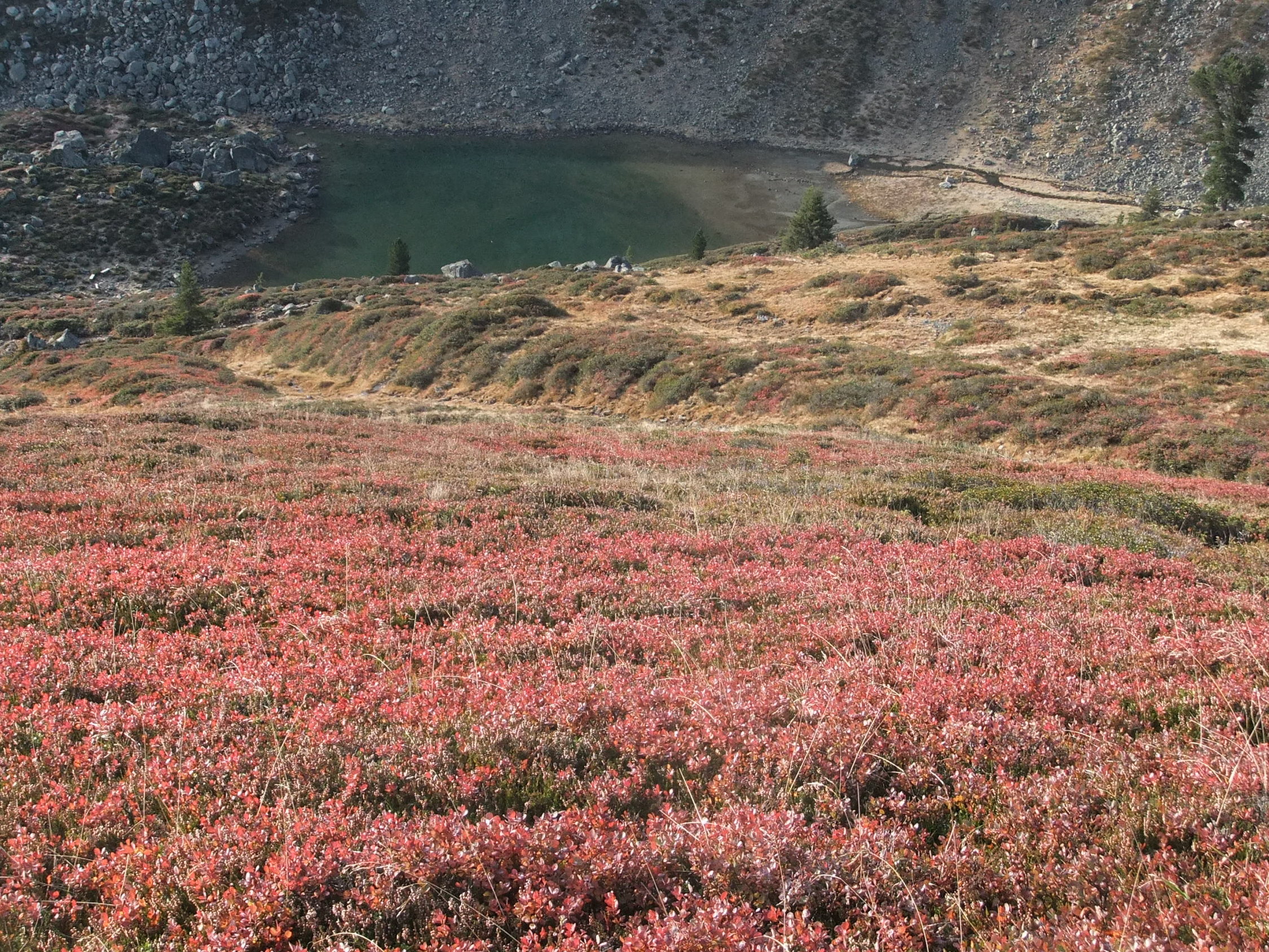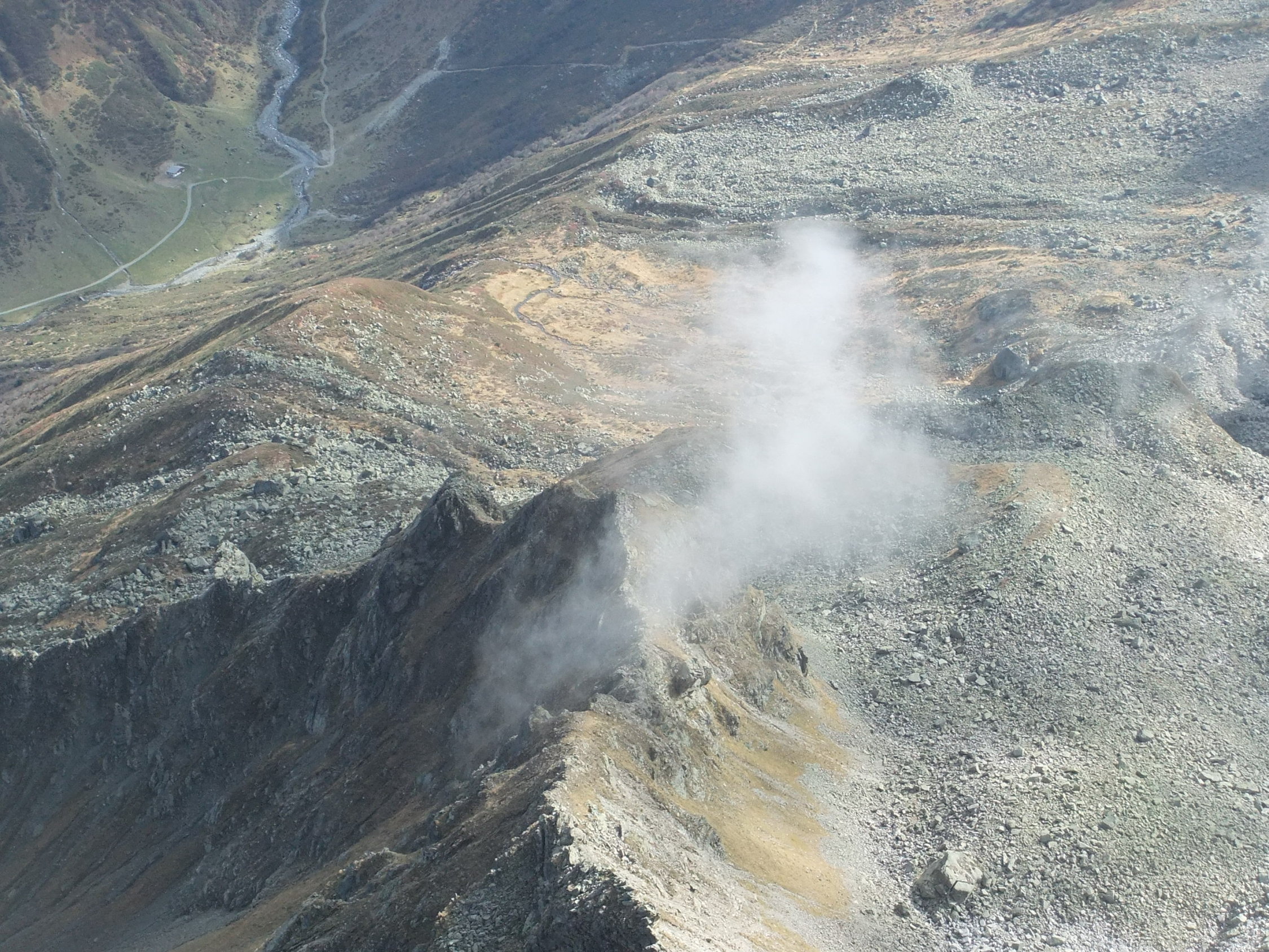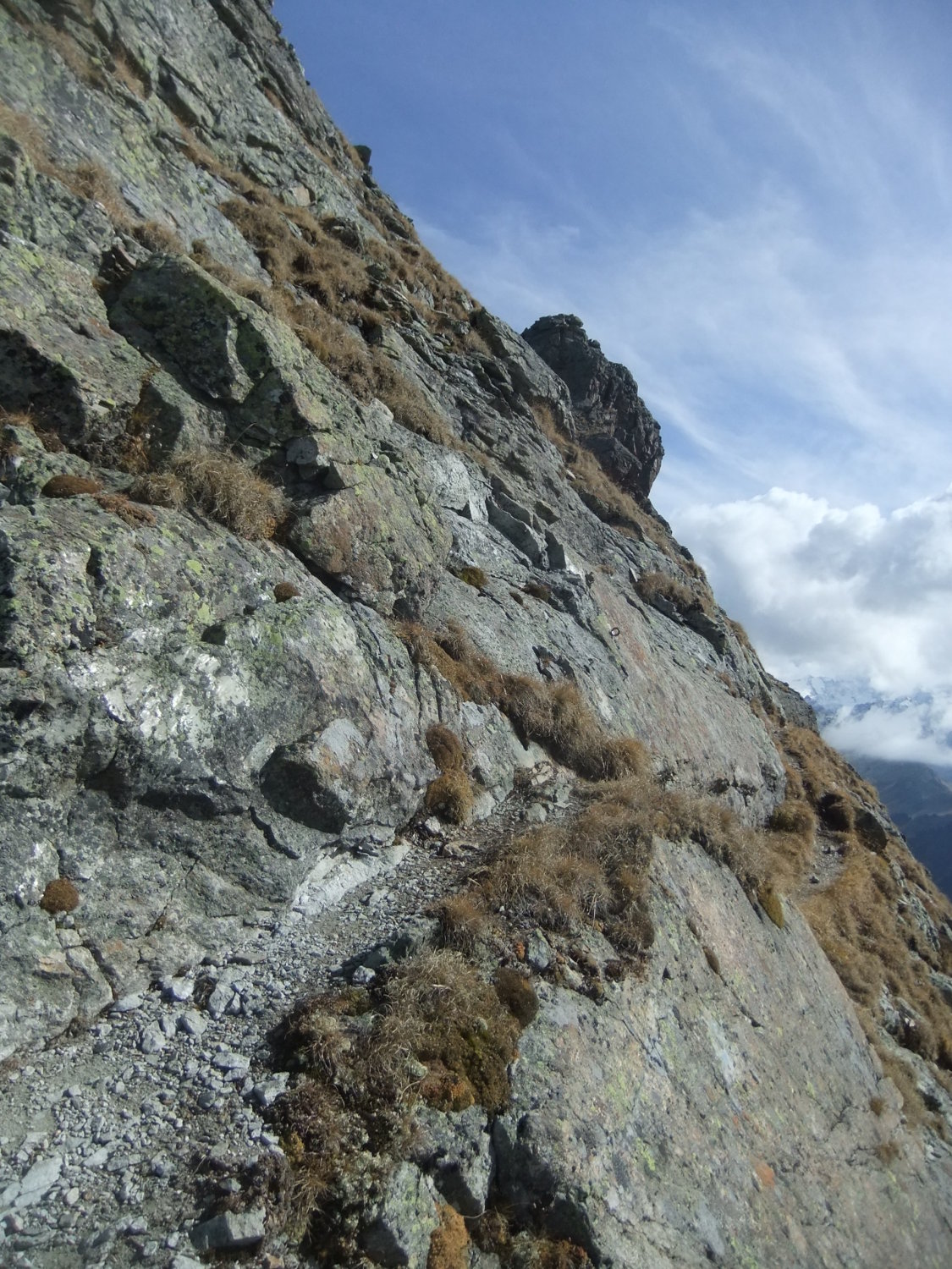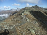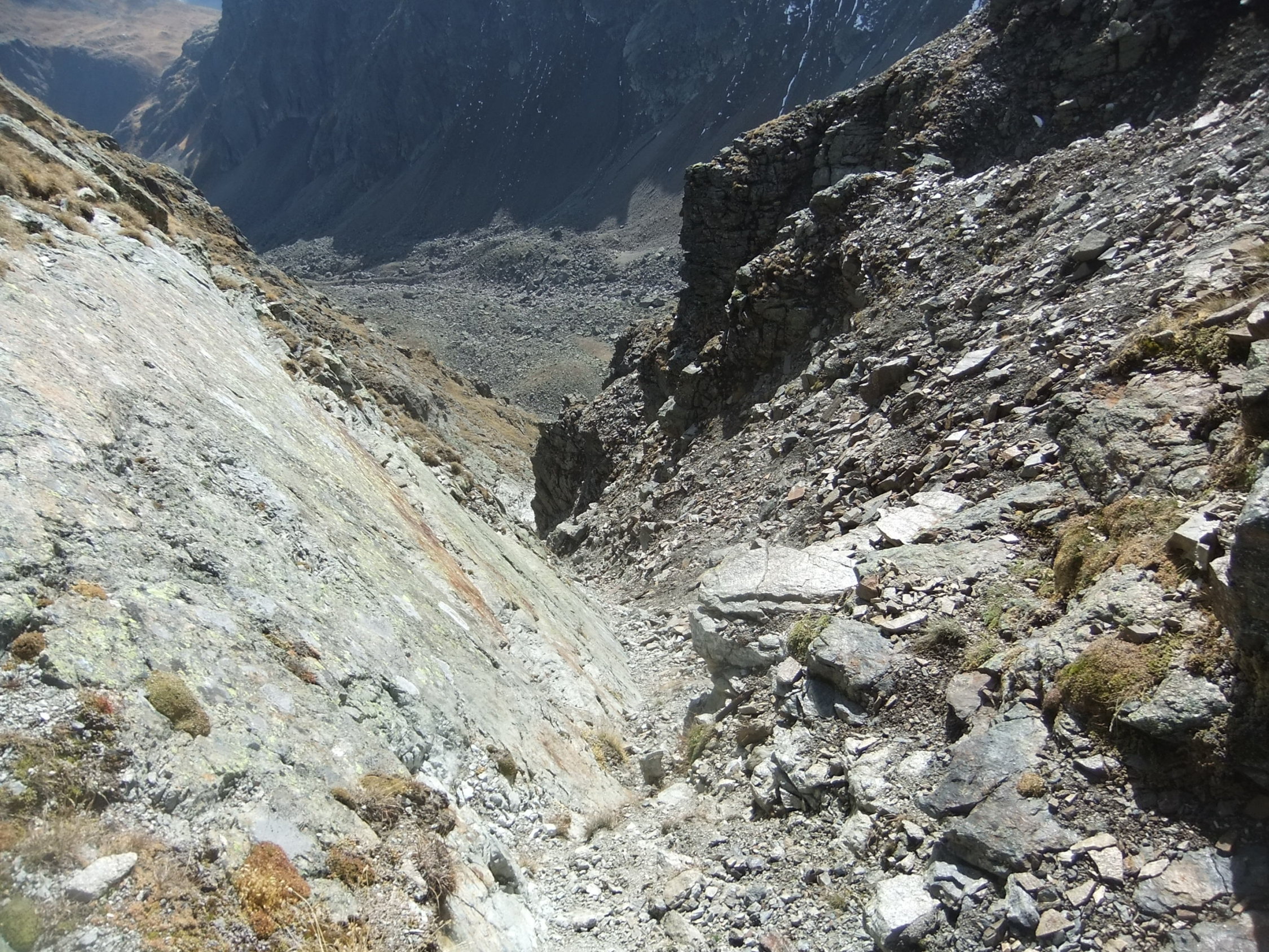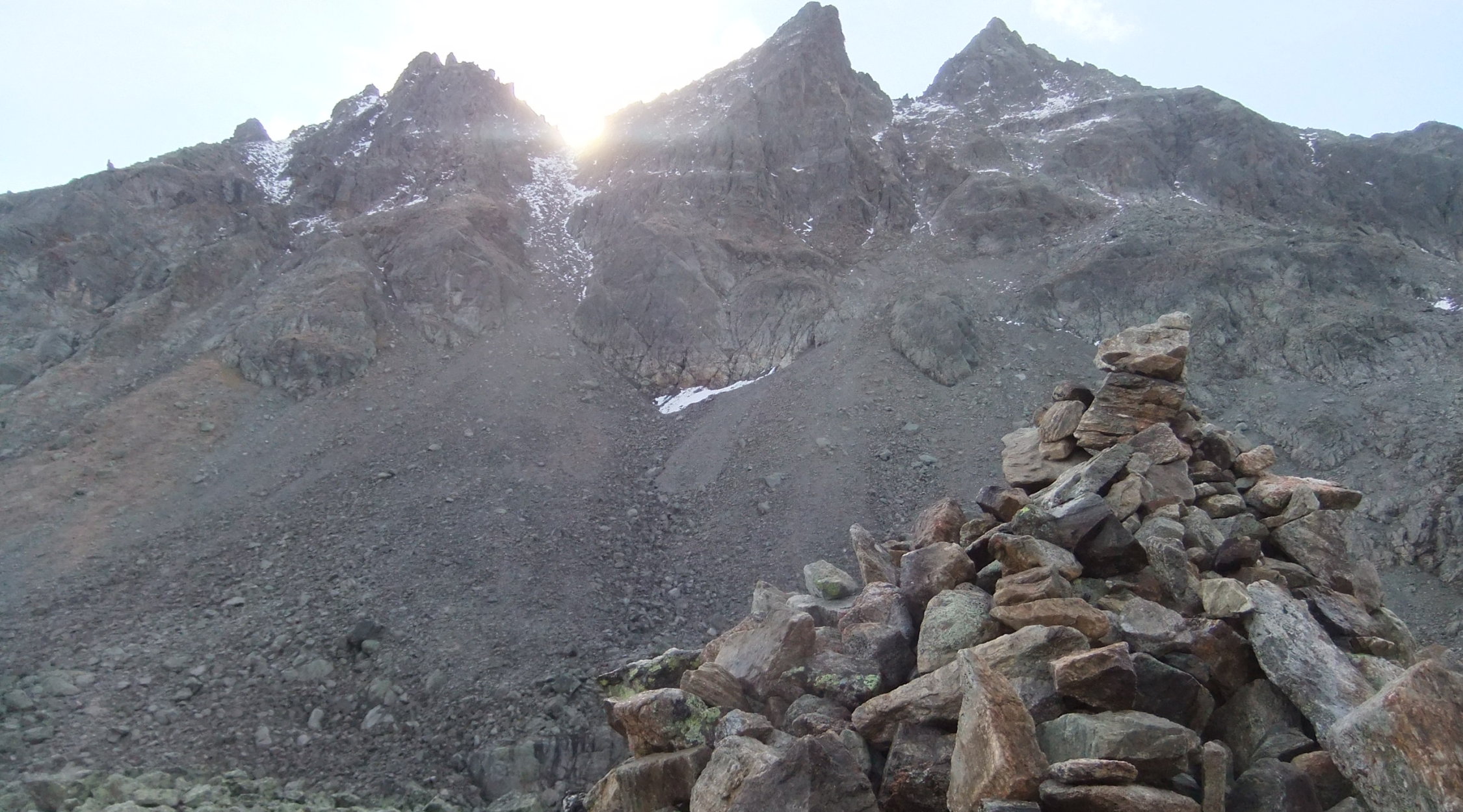 Ursprünglich wollte ich den Aufstieg südseitig beginnen. Darum lief ich bis zum Juonenfürggli. Von dort blickt man auf die Südseite der Madrisa, sieht jedoch nicht in die Südrinne ein. Da mir einerseits aus dieser Perspektive die Felsseite sehr steil vorkam, andererseits ich nicht viel Lust verspürte, obendrein weglos 200 m hinab zu steigen, um womöglich wieder umzukehren, zog ich es vor umzudrehen, und den Aufstieg nordseitig anzugehen, deren Route man von der Steinpyramide unterhalb des Gafierjöchle im unteren Bereich gut einsehen kann, und die mir nicht so steil vorkam. Von der Scharte, wo die Nordroute am Westgrat ankommt, sieht man in die Südrinne hinab. Von dort erschien sie mir nicht so steil. Drum stieg ich dann dort ab. Außerdem laufe ich Felsrinnen lieber bergab, wo man sich besser orientieren kann als hochwärts und nicht einen Schritt zurück rollt bei 2 Schritten. Die Abstiegsvariante durchs Gandatal ist keine Empfehlung, da man weglos nur langsam vorwärts kommt. Dann besser 180 Hm hinauf zum Juonenfürggli und auf bequemen Pfaden und Wegen hinab.
