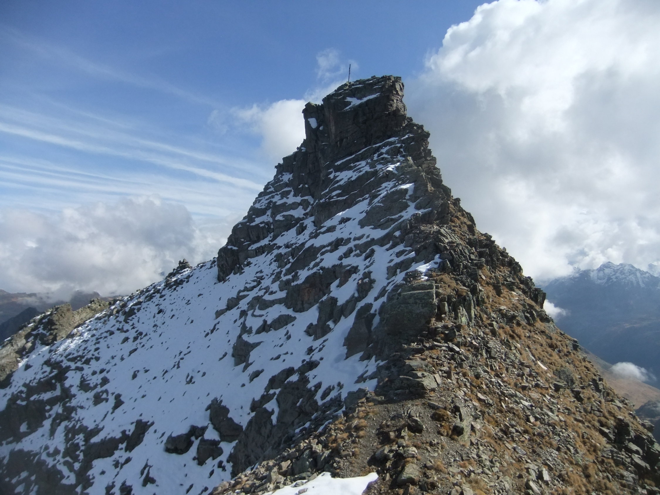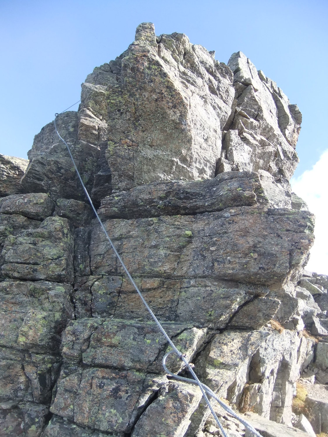 Für die Nordtraverse unterhalb letzten Gipfelblocks vor dem Gipfelturm zog ich die Sommersteigeisen an, da der Schnee noch fest überfroren war. Einige Felssteine im Bereich des Stahlseils im Gipfelturm waren tückisch übereist. Das Seil ist aus gutem Grund dort vorhanden.