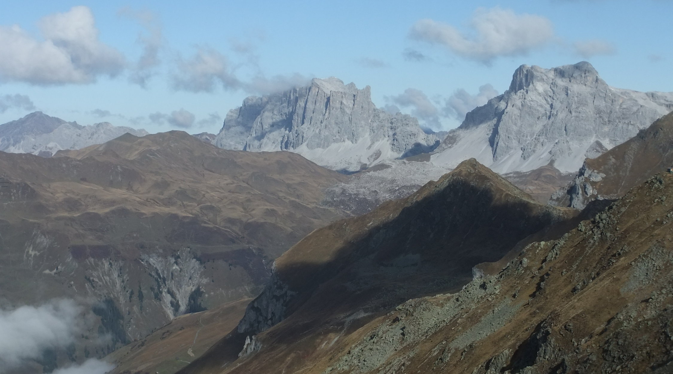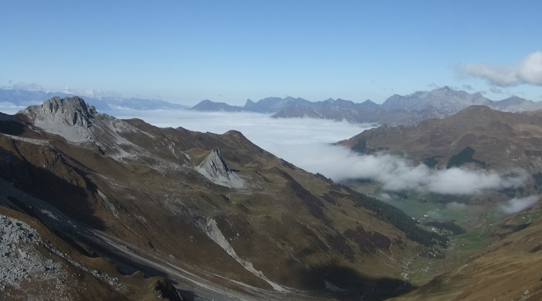 Nach sternenklarer Nacht wolkenfreier Morgen, aber frisch und in den Scharten windig. Die Nordseite war nur im oberen Bereich schneedurchsetzt, der allerdings stark verfirnt war. Die Täler lagen im Hochnebel. Der Nebel zog im Valzifenztal ab 16:00 hoch als ich mit dem Abstieg zur Oberen Valzifenz-Alpe fast fertig war. Im Gandatal gibt es keine Trittspuren oder Markierungen. Ist nur zu empfehlen für Wintertouren (Madrisajoch). Unterhalb des Juonenfürggli 3 Steinböcke angetroffen. Bis auf einen Wanderer am Gandasee, war sonst niemand hier unterwegs. Die Bergbahnen sind nicht mehr in Betrieb bis zum Beginn der Wintersaison. Und so auch die Hütten.