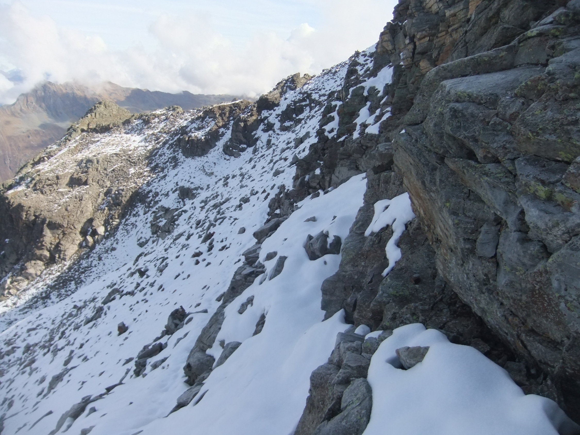 Bis Sommer halten sich Schneereste in der nordwestlich ausgerichteten Felsrinne, so daß ein Durchstieg erst im Spätsommer ratsam ist. Ansonsten sollte man Steigeisen und Eishandgerät mitführen.