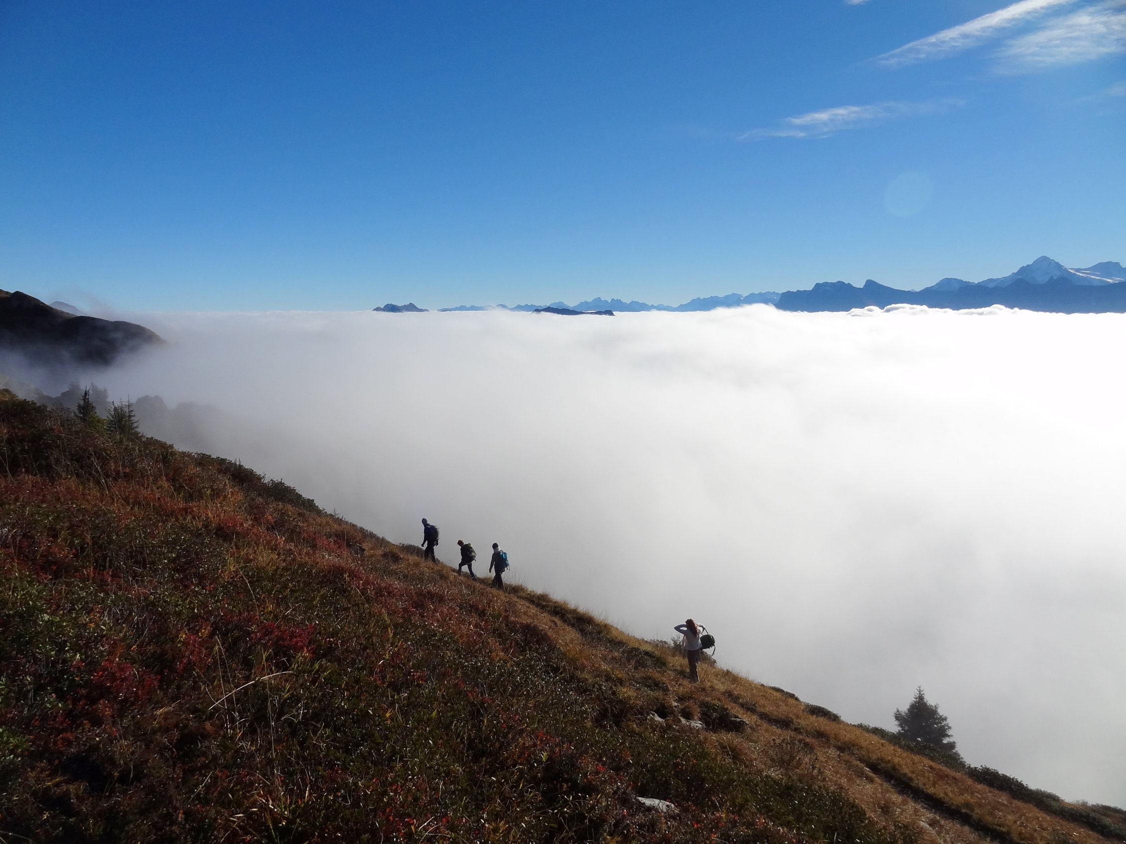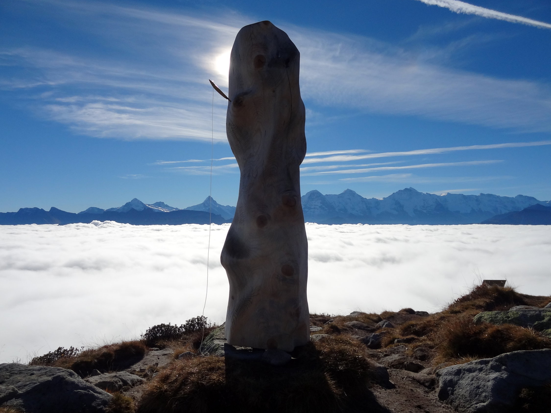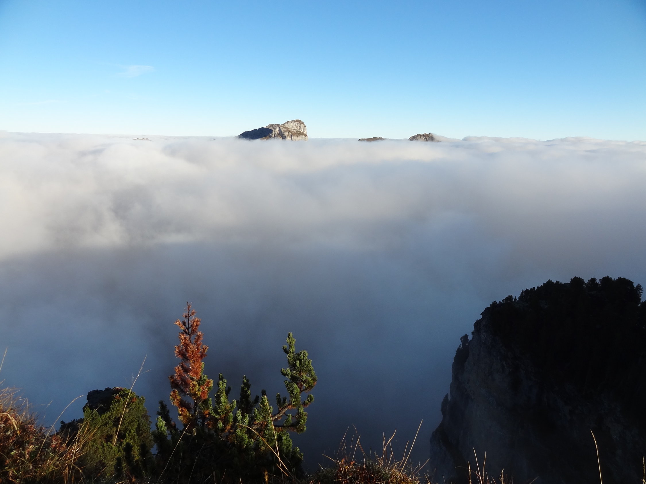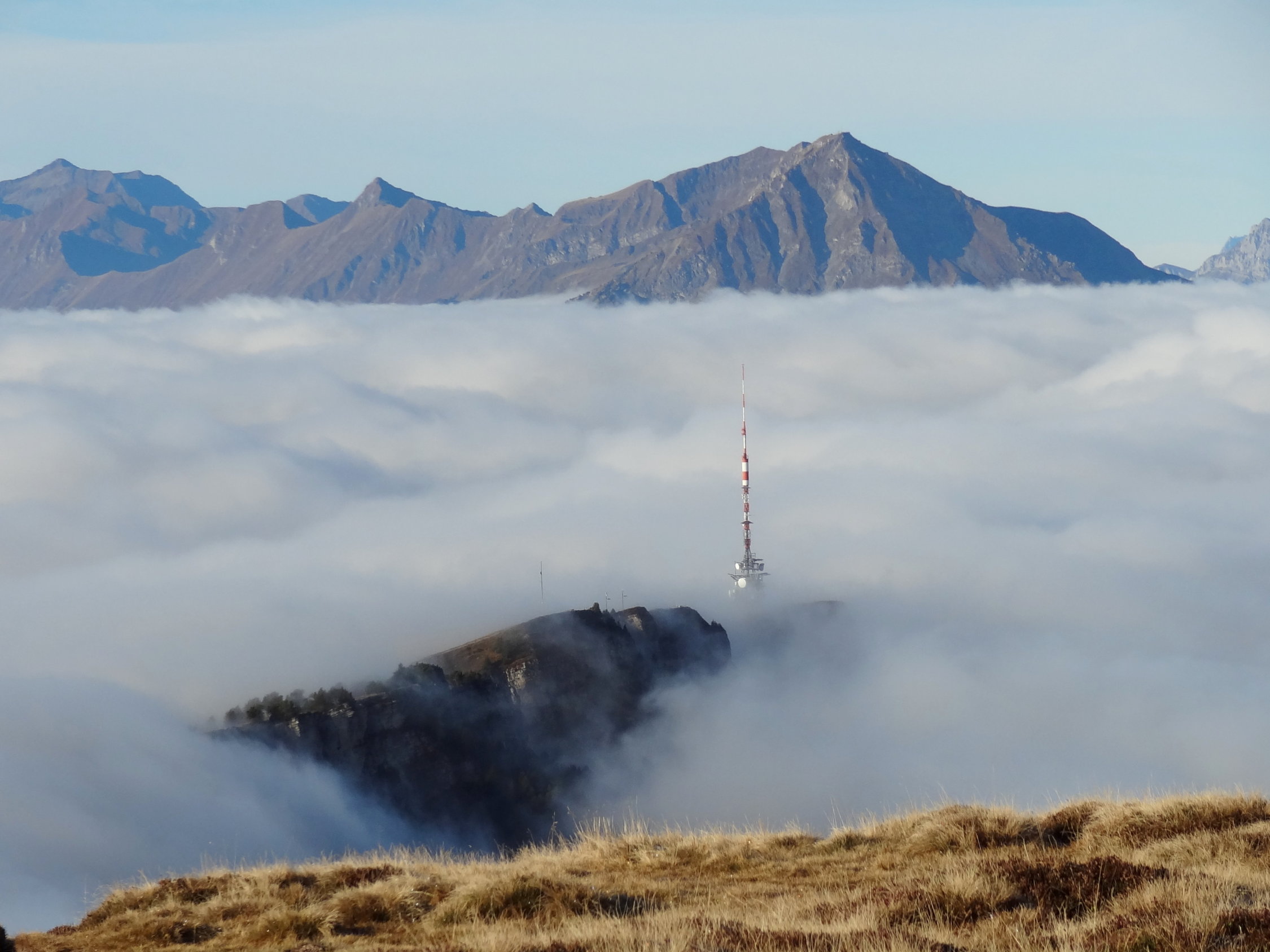 Sehr interessant. Niederhorn Gipfel um 0830 knapp nebelfrei. Auf dem ganzen Weg waren nur die Erhebungen über 1900m. nebelfrei, sonst wanderte man vom einen Nebel"Wasserfall" zum anderen. Darüber schönste Sonne. Eine fantastische Stimmung.