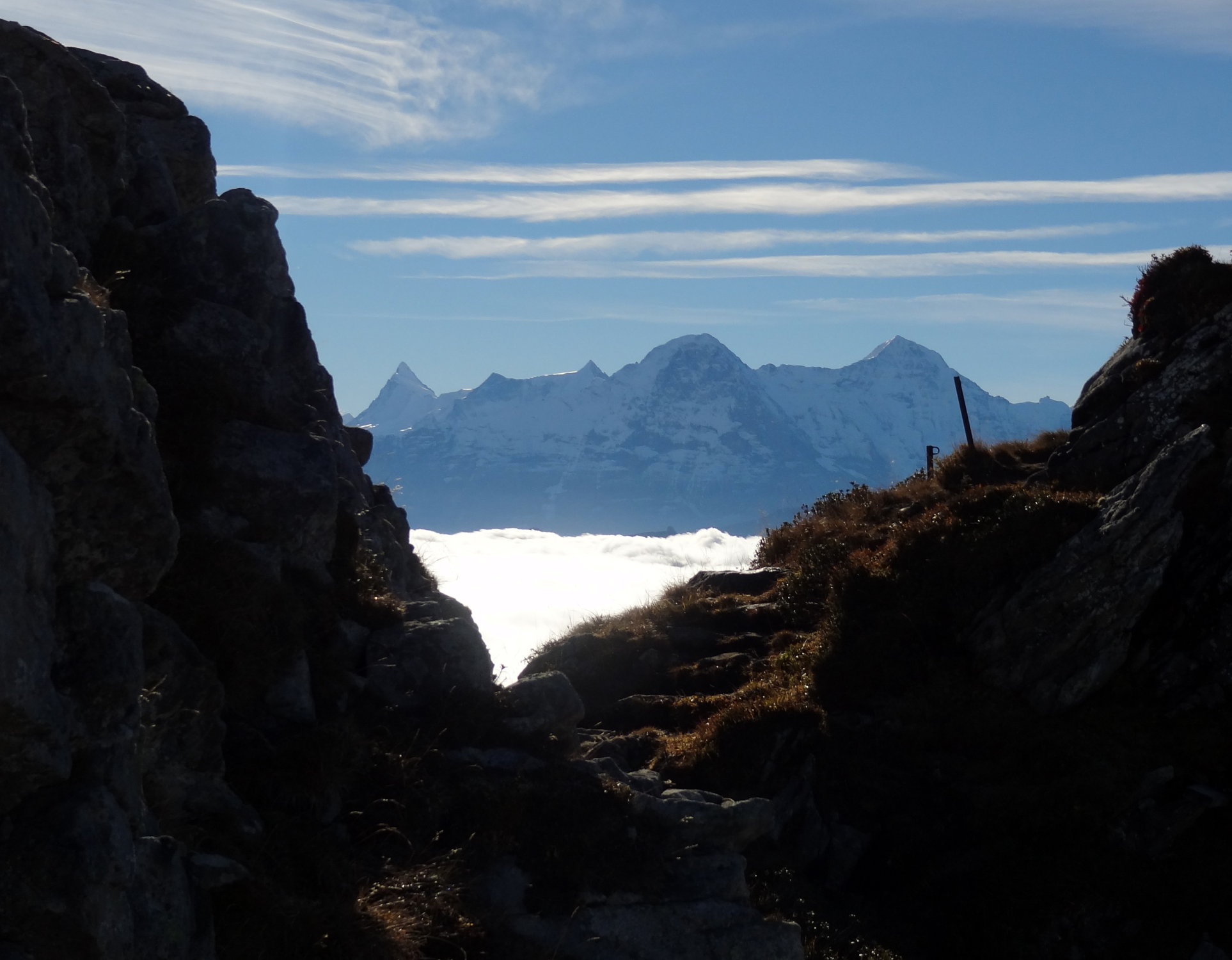 Bei einer solchen Wetterlage mit Hochnebel auf 1900-2000m. und bei Bisestaulage ist die Bergkette vom Niederhorn bis zum Hohgant eine der besten Adressen. Dazu kommt, dass die Aussicht so schön ist, das man sich nicht satt sehen kann. Sieht man noch Steinböcke dazu, so ist es perfekt. Mit dem ÖV ist man sehr schnell oben und kann sich auf leichten und guten Bergwegen bewegen. Dass trotz guter Ausrüstung Trittsicherheit und auch Schwindelfreiheit braucht, sollte es selbstverständlich sein.