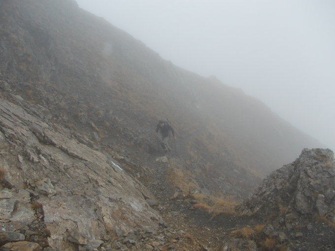 Route feucht, mit ein paar gespurten Schneeflecken ab ca. 2700 m. Herkömmliche Wanderausrüstung reicht aber aus, die Route weist derzeit keine nennenswerten Probleme auf.Im Falle größerer Frequentierung könnte die Mitnahme des Steinschlaghelms nicht schaden.
