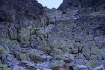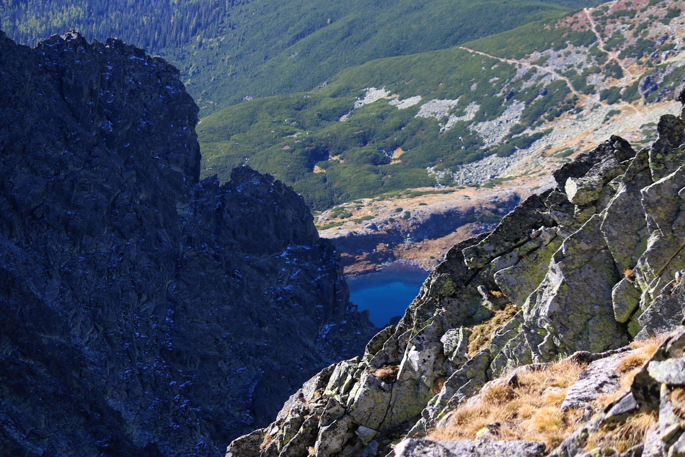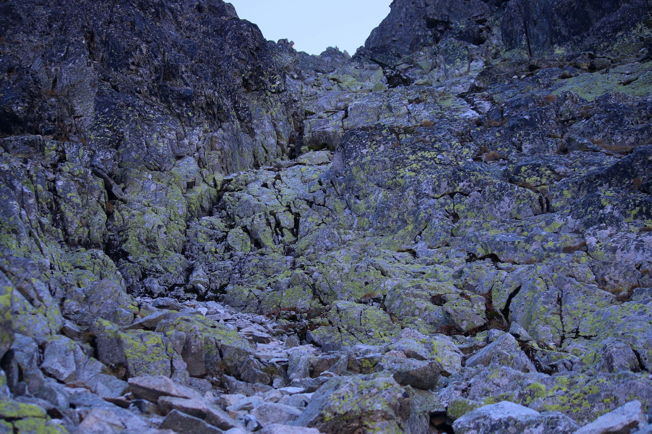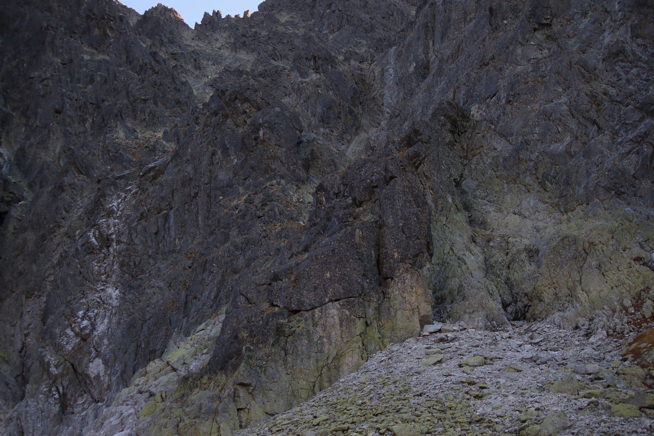 Bis zum Bergsee wo ich eine kurze Rast hielt traf ich niemand. Erst beim Bergsee überaschte ich einen biwakierenden Ungaren der tags zuvor auf dem Gerlachovský štít war. Der Zustieg zum Westwandcouloir war einfach zu finden. Oberhalb des Sees ist ein Pfad vorhanden der bis unter die Felsbarriere leitet. Er verliert sich dort stellenweise in einer Geröllflanke rechts der Felsbarriere. Das Geröllfeld besteht aus teils grossen Felsblöcken durch die man nachlinks oben aufsteigt so dass man über die Felsbarriere gelangt. Hier waren wieder eindeutig Wegspuren zu sehen denen ich folgte. Sie leiten direkt zum Einstieg wo etwa 10m oberhalb schon ein Fixseil erkante. Hier traf ich auch auf vier Tschechen die ebenfalls auf den Gipfel wollten. Unterwegs überholten wir uns mehrmals gegenseitig so dass wir eigentlich den Gipfel gemeinsam bestiegen.