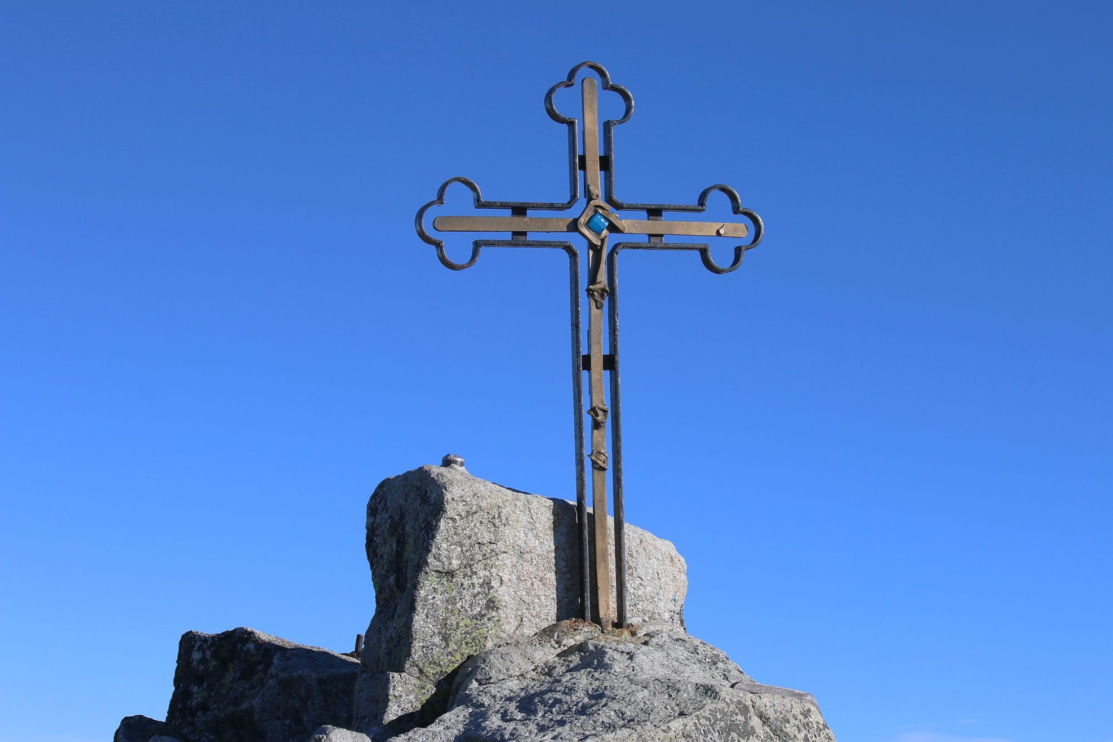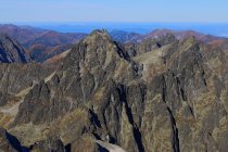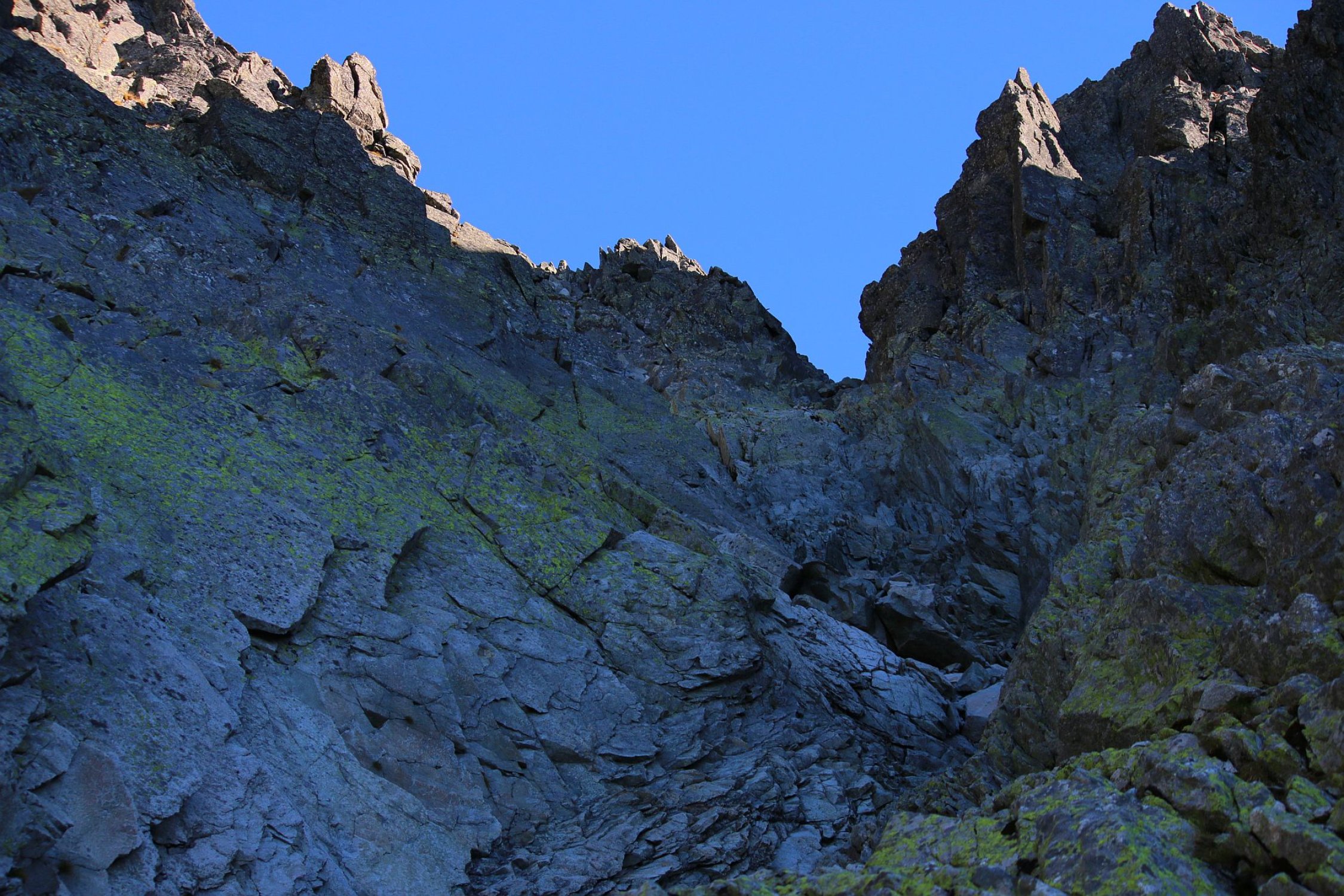 Mit aufgesetztem Helm stieg ich in die Westwand ein um den Gipfel über die Route durch die Batizovská próba zu erklettern. Nach wenigen einfachen Kletterzügen erreichte ich das Fixseil das einem die Richtung nach links oben in eine Verengung weist. Oberhalb des Seils kletterte ich einige Meter weiter bis zu einer senkrechten Stelle die man mit Hilfe einger Metalltritten überwindet. Oberhalb dieser Stelle ass ich eine Babane und trank nochmals als Stärkung für die weitere Kletterei zum Gipfel. Es ging nun wieder gemütlicher weiter. Zuerts noch wenig steigend, dann wieder mit etwas Kletterei ging es gerade hinauf weiter. Nach der einfchen Kletterei ging die Route wieder etwas mehr nach links und es flogte eine ziemlich steile Passage wo sich auch Sicherungshaken befinden. Am oberen Ende trifft man wieder auf Metallsteighilfen mit deren Hilfe eine Felskante überwunden wird. Die Metalltritte sind ziemlich weit auseinander und eine Stelle ist leicht überhängend. Dieser zweite und letzte kleine Klettersteig wird oft schwierigste Stelle der Tour bezeichnet, ich hatte aber keine Mühe hier - ohne Steighilfen wär es aber eine sehr schwierige Kletterei gewesen! Nun ging es eher einfach weiter. Man sieht nun die eindeutige Rinne aus fast weissen Fels der man folgen muss. Zuerst würde es links der Rinne hochgehen. Ich stieg aber zuerst rechts der Rinne hoch und musste dann in die Rinne reinklettern. Danach raxelte ich stets in der Rinne oder knall auf der linken Seite. In der Rinne gewann ich rasch an Höhe und erreichte nach etwa einer Stunde seit der oberen Klettersteigstelle den Südgratsattel Batizovská priehyba. Hier bot sich eine phantastische Aussicht nach Osten zu weiteren Gipfeln mit über 2600m Höhe. Der Südgrat war schliesslich der schönste Teil der Tour und bot etliche schöne, aber einfache Kletterstellen mit viel Luft unter den Füssen. Der Grat war kurz und schon bald sah ich das nahe Gipfelkreuz. Die letzten Meter zum Dach der Slowakei waren wieder einfaches Gehgelände und ich spurtete dem Kreuz entgegen.