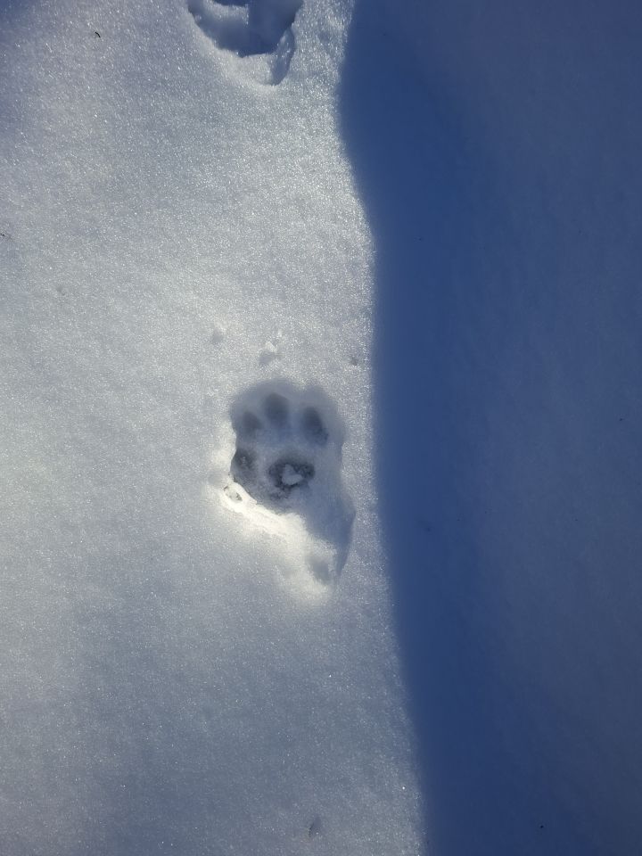Nachtrag: Valentin hat mich darauf aufmerksam gemacht, dass es auch ein Luchs sein könnte. Hab mir daraufhin mal Luchsspuren im Netz angeschaut und ja, genau so sehen sie aus!