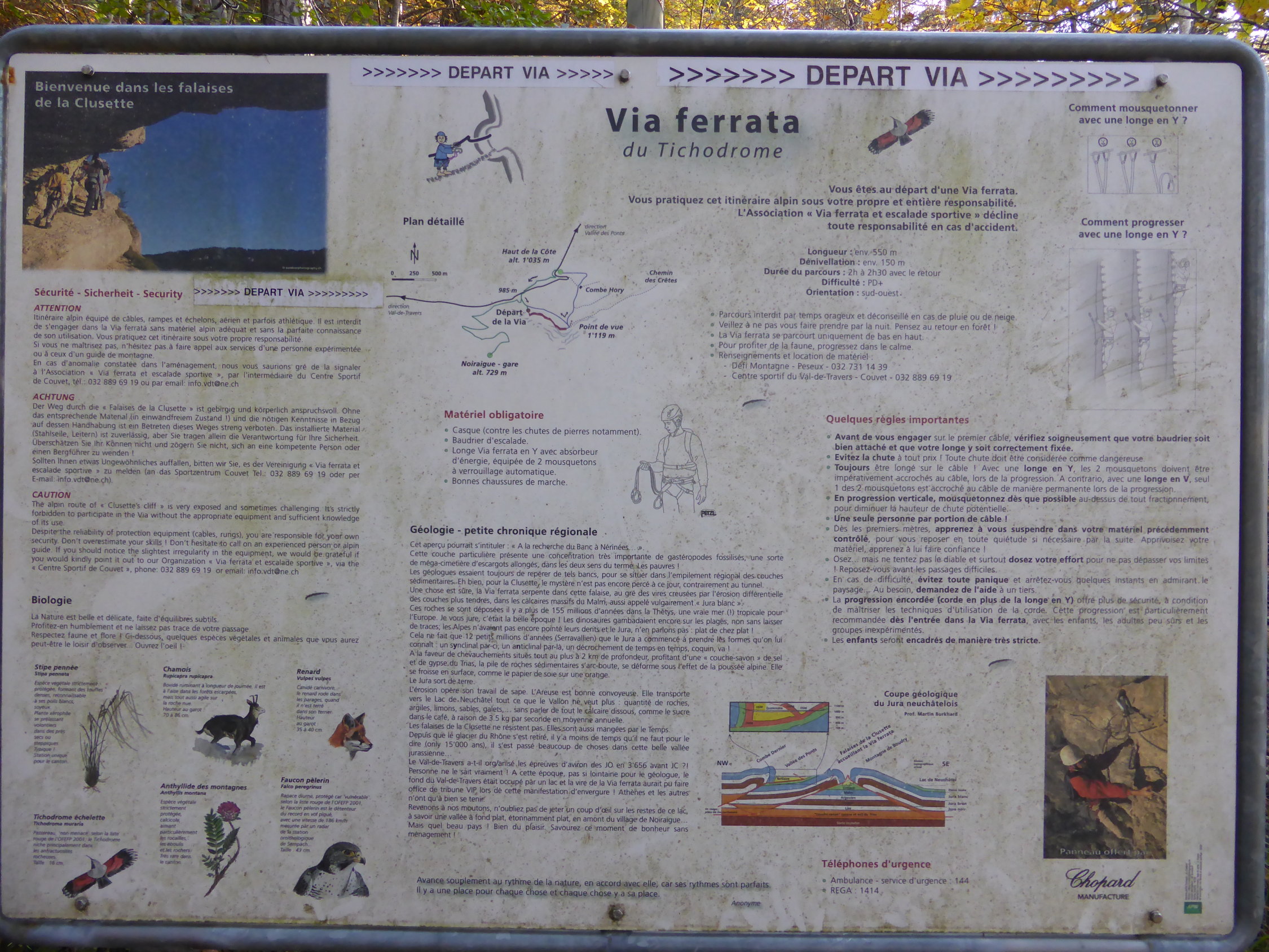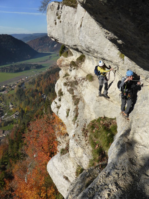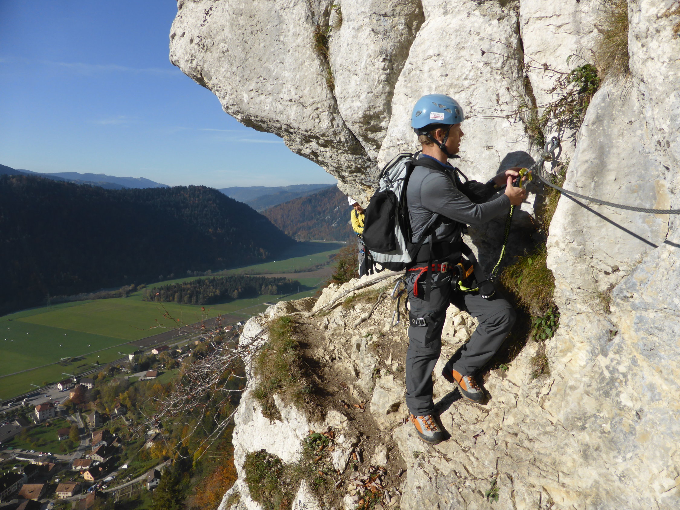 Der Klettersteig bietet wunderbare Einblicke ins Val de Travers. Er eignet sich auch für Anfänger sowie Kinder ab ca. 8 Jahren. Bei der Schlüsselstelle sind Sicherungsseile für Erwachsene und Kinder vorhanden.