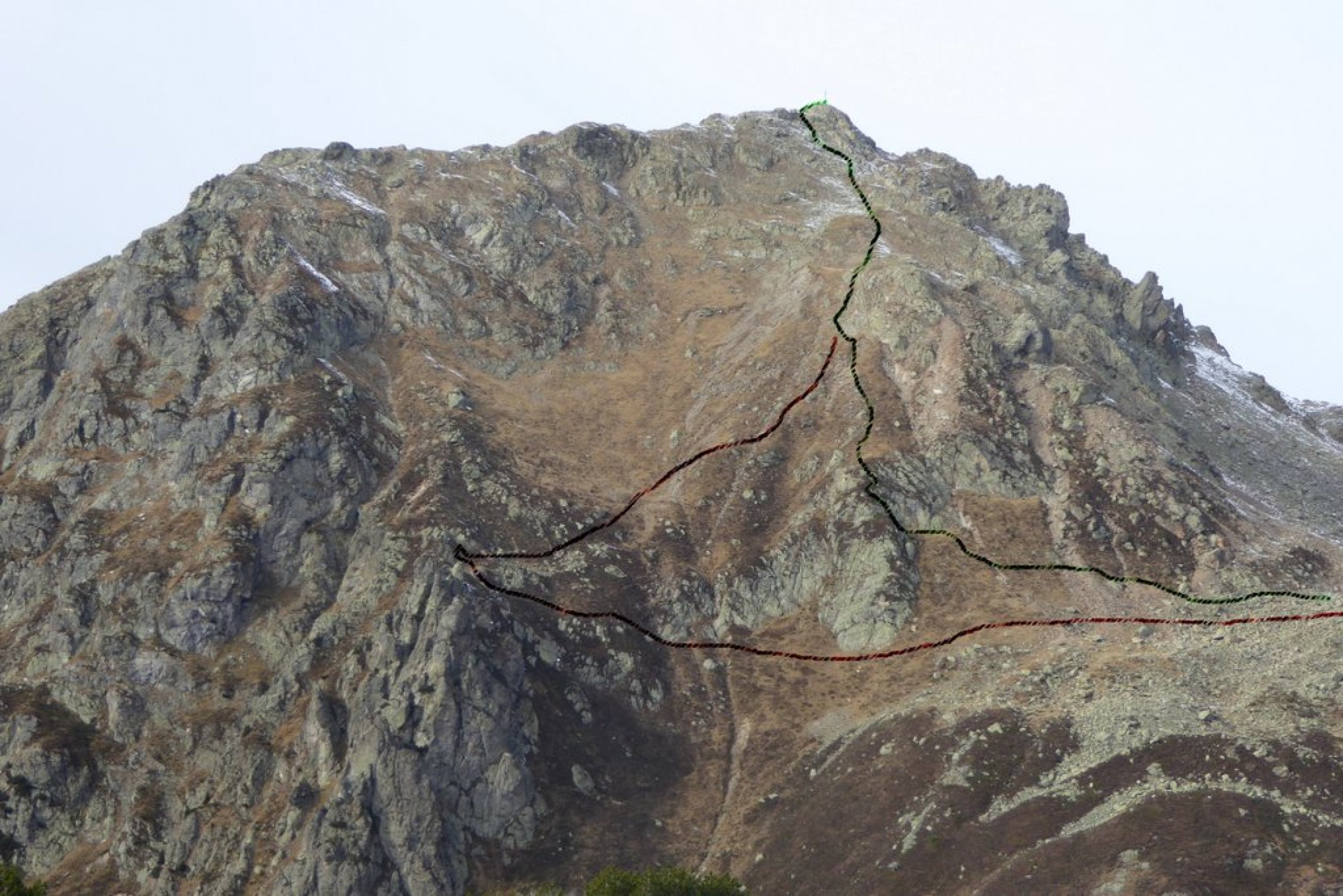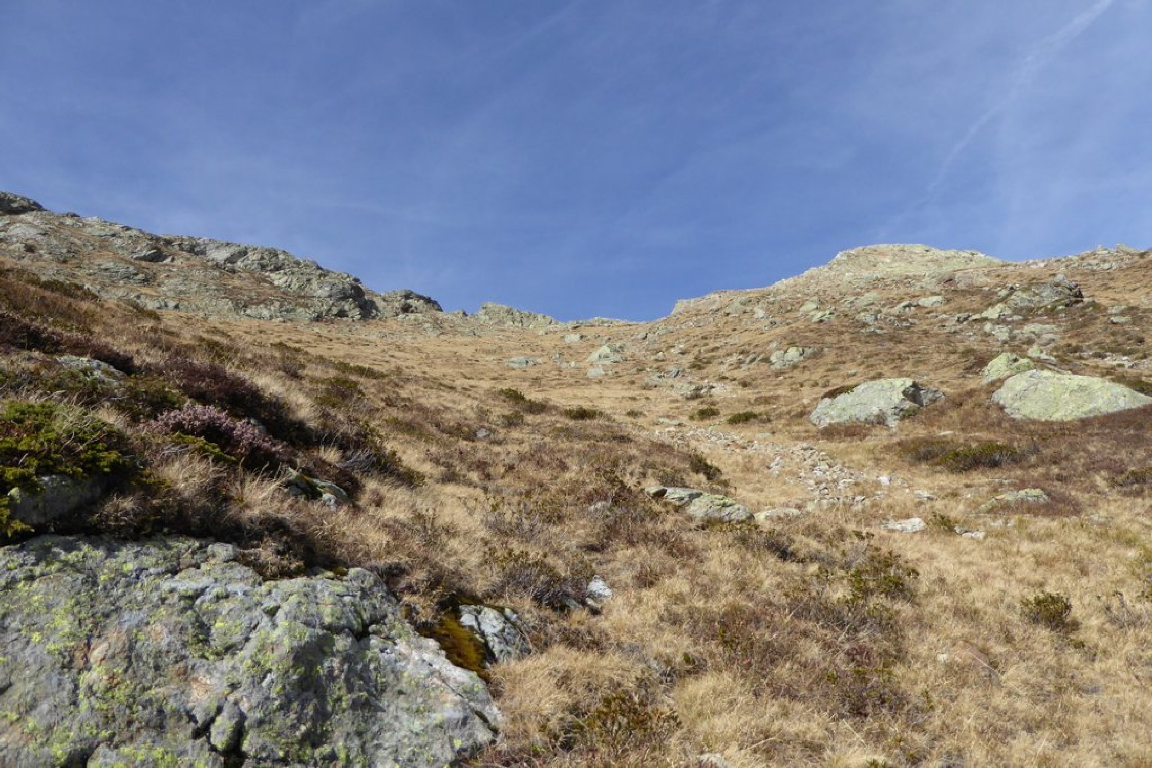 Als wir im Abstieg waren und der den grasigen Gipfelhang querten viele Steine runter. Somit war der diretissima Aufstieg angenehmer