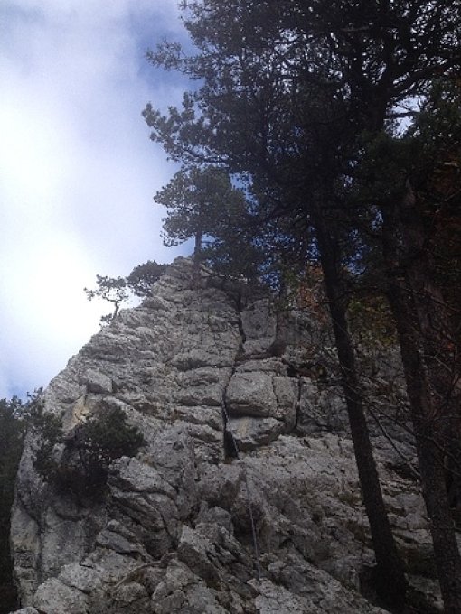 Fels trocken. Am Einstieg (wir haben den schwierigen Teil rechts umgangen) Gras und Sand, der das Klettern erschwerte. Warm und teilweise sonnig.