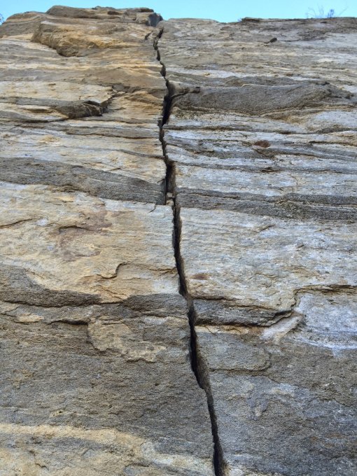 Der Riss und überhaupt der ganze Sektor sind komplett trocken. Die Routen sind noch sehr jung und der Fels ist noch nicht total abgeklettert.