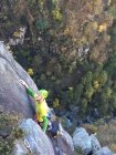 In der Schlüsselseillänge und der darauf folgenden 6b Länge liegen noch ein paar lose Blöcke. Kein Problem, aber runter werfen sollte man sie auch nicht, da sie genau auf den Sicherungsmann fallen.