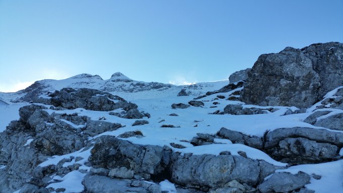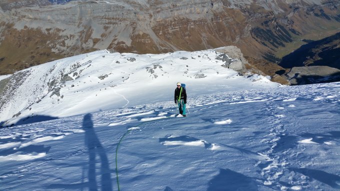 Grand Beau mit starken Windböen aus O und S. Seilschaften vor uns sind wegen dem Wind alle umgedreht. Schnee in nordseitiger Lage ab ca. 2100m, auf 2500m rund 20cm und auf 3000m rund 50cm. Schnee stark verfrachtet. In Iswändli und auf Gletscher keine Spalten sichtbar. Westgrat des Hauptgipfels ziemlich eingeschneit - Kletterei könnte schon mixed sein.