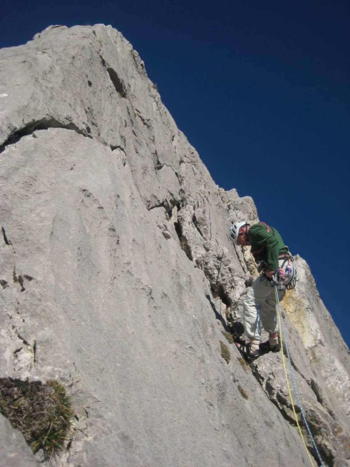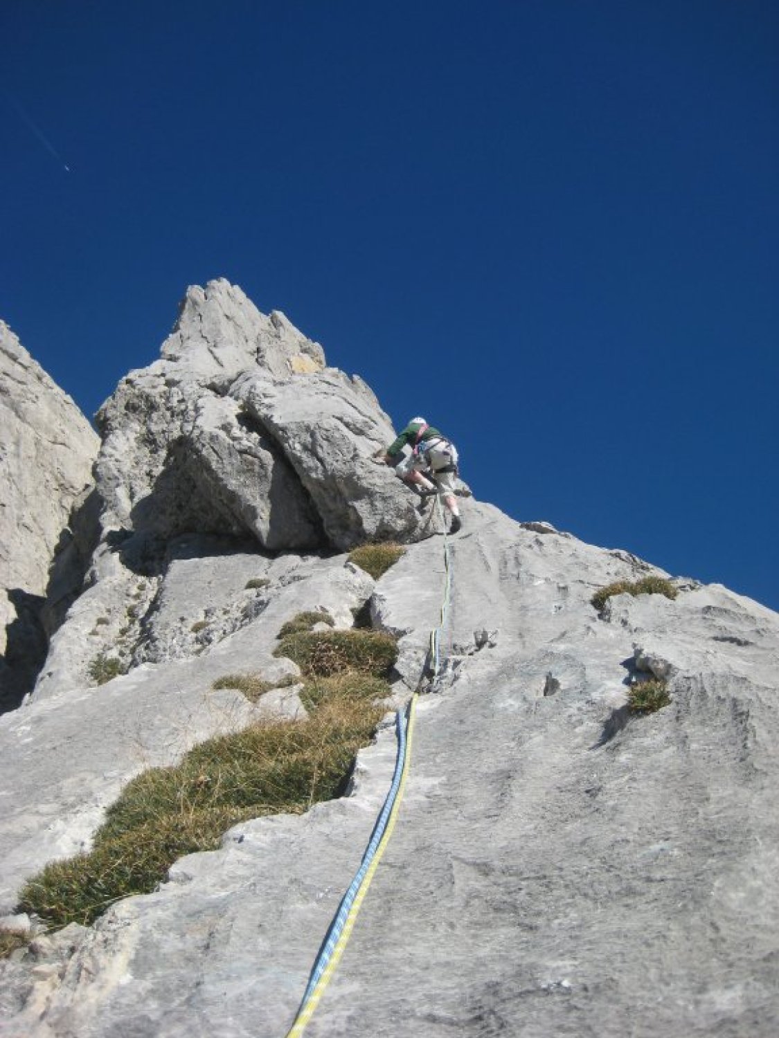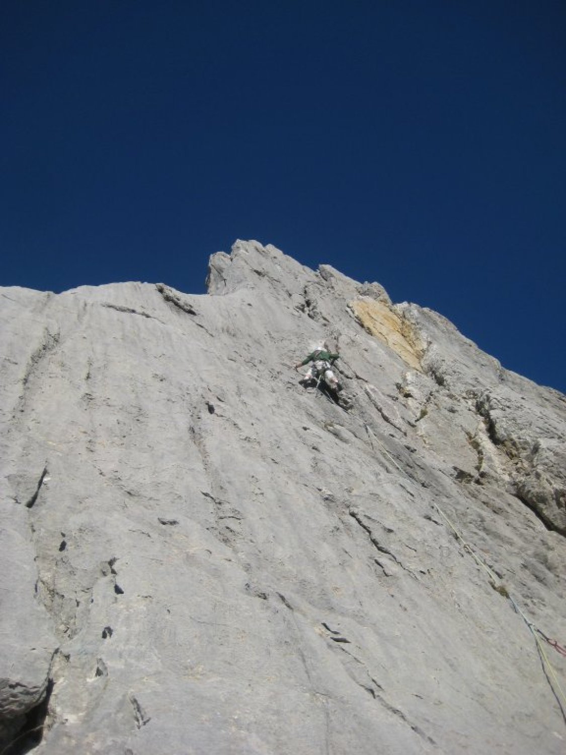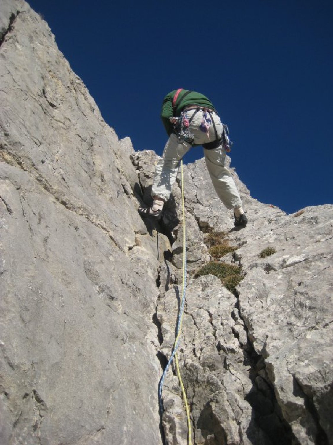 P war zwar gut besucht, aber absolut ruhig den ganzen Tag. An der Kante nur 1 weitere Seilschaft, als wir einstiegen waren die schon wieder unten, Gruß noch an das Paar. Die Tour heißt zwar Schönebergkante führt aber auf das Schönegg 2243m. Der Schöneberg liegt etwas NW und ist mit 2282m kotiert. Wir bewegtenuns im oberen Teil etwas rechst der Kante dies dürfte max. 5- gewesen sein. Kante dir.VI dann gibt es noch kleine Varianten mit gut V.