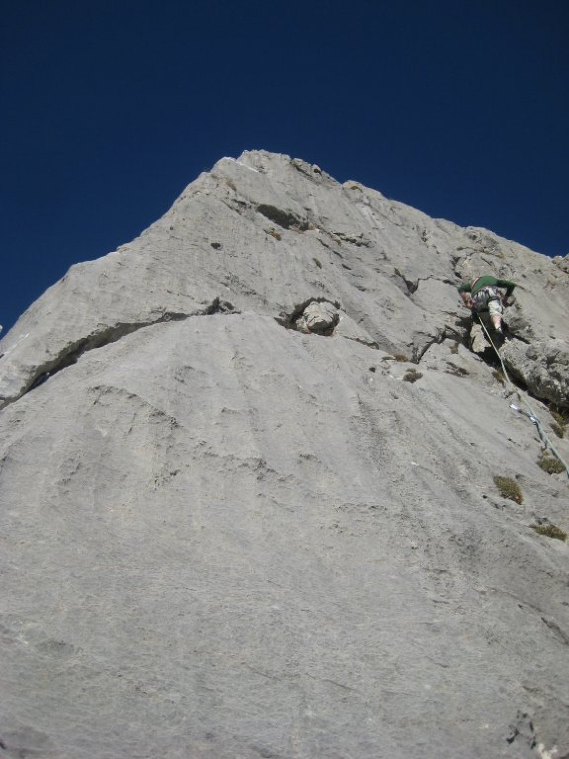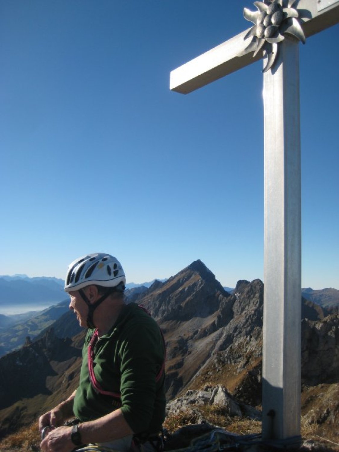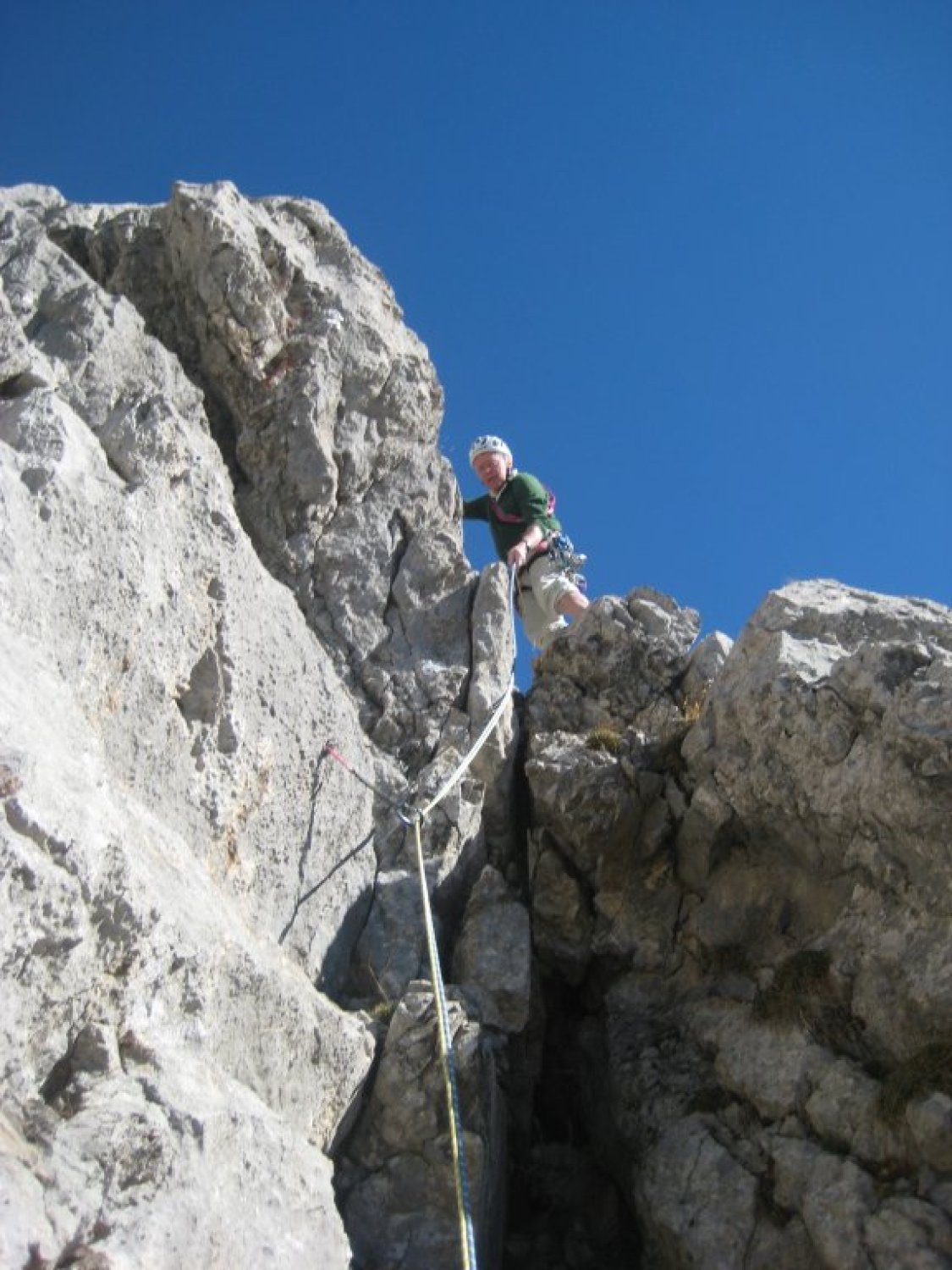 P war zwar gut besucht, aber absolut ruhig den ganzen Tag. An der Kante nur 1 weitere Seilschaft, als wir einstiegen waren die schon wieder unten, Gruß noch an das Paar. Die Tour heißt zwar Schönebergkante führt aber auf das Schönegg 2243m. Der Schöneberg liegt etwas NW und ist mit 2282m kotiert. Wir bewegtenuns im oberen Teil etwas rechst der Kante dies dürfte max. 5- gewesen sein. Kante dir.VI dann gibt es noch kleine Varianten mit gut V.