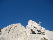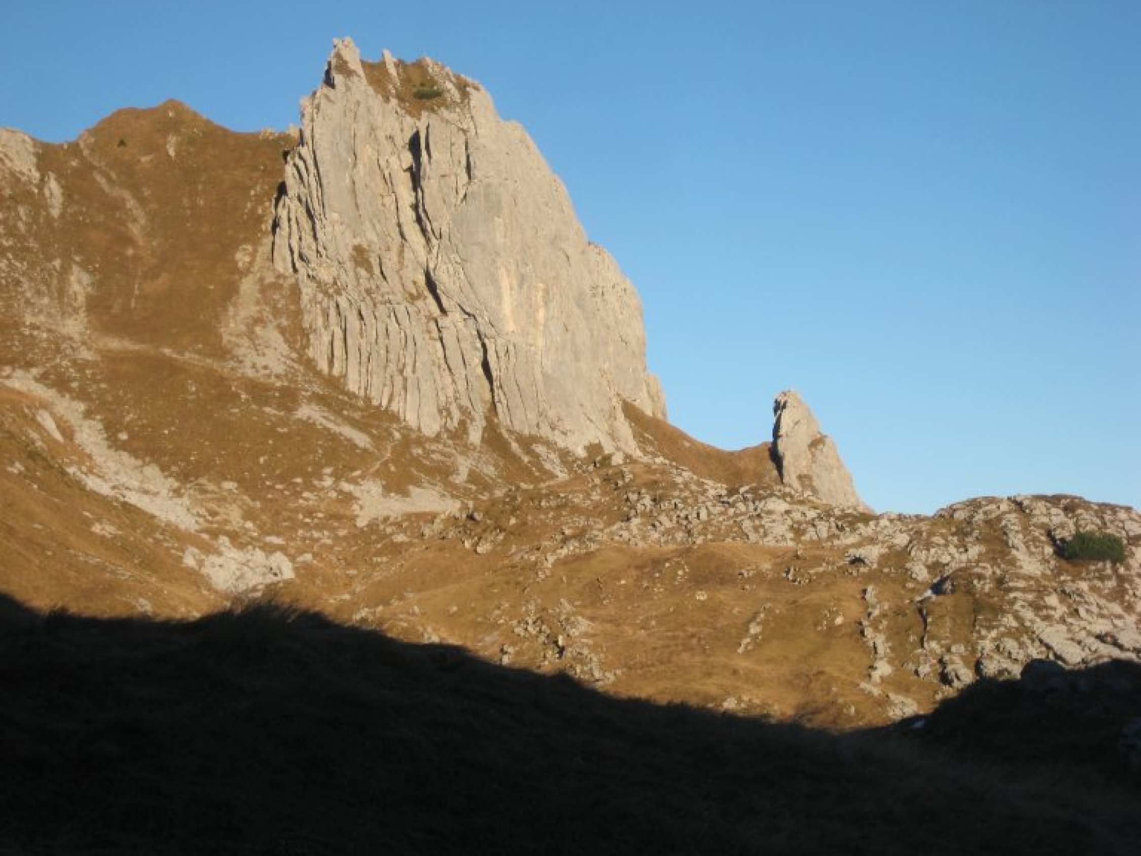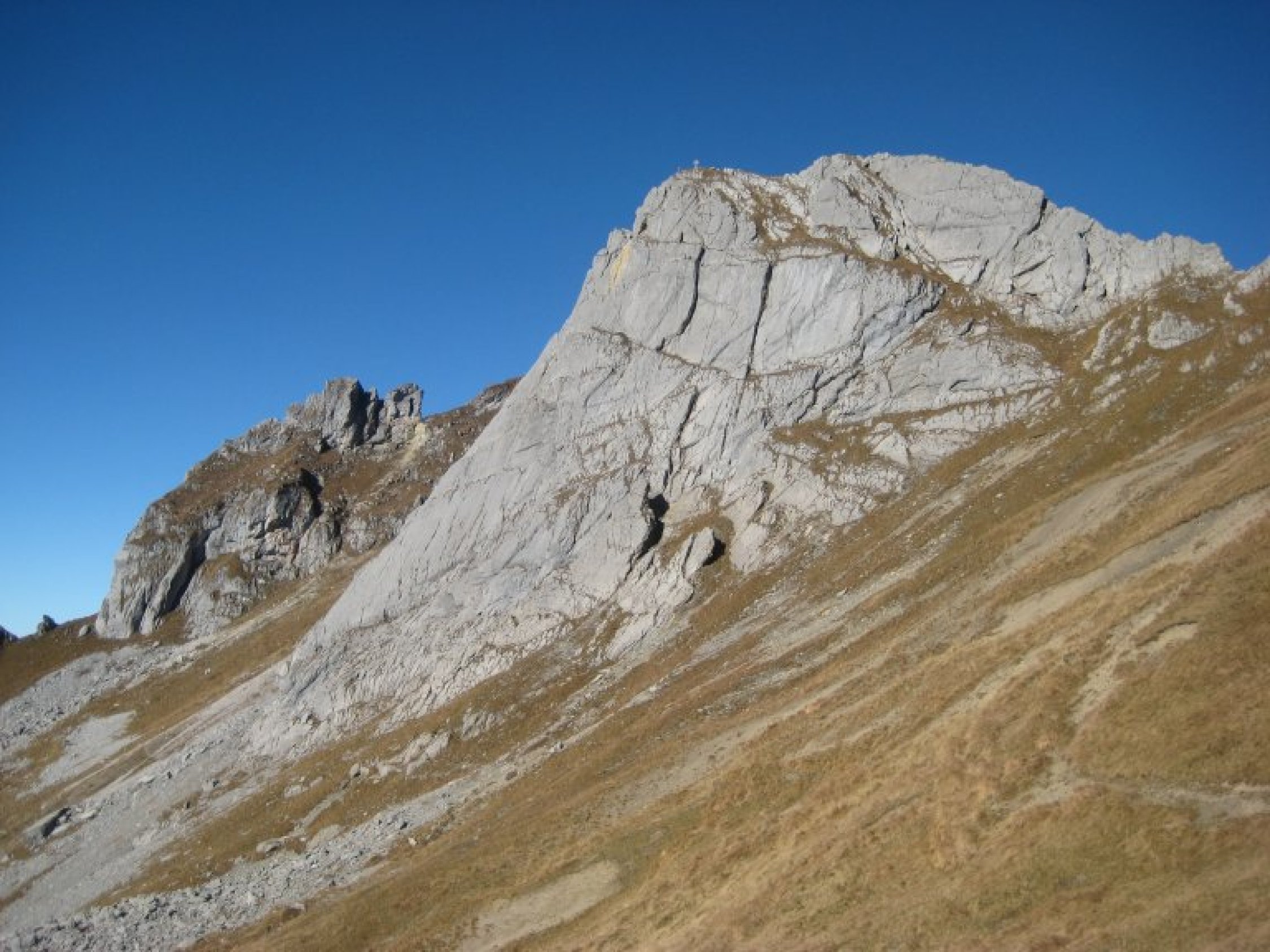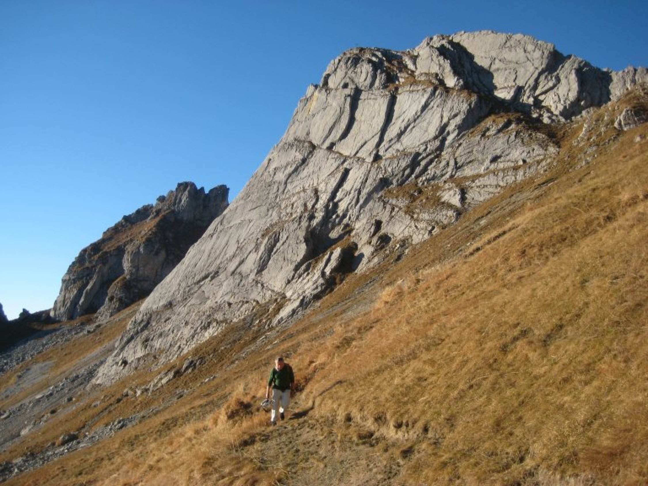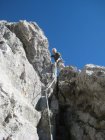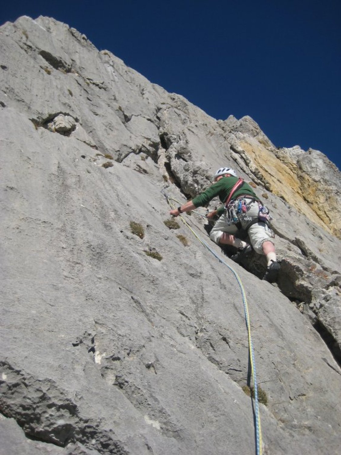 P war zwar gut besucht, aber absolut ruhig den ganzen Tag. An der Kante nur 1 weitere Seilschaft, als wir einstiegen waren die schon wieder unten, Gruß noch an das Paar. Die Tour heißt zwar Schönebergkante führt aber auf das Schönegg 2243m. Der Schöneberg liegt etwas NW und ist mit 2282m kotiert. Wir bewegtenuns im oberen Teil etwas rechst der Kante dies dürfte max. 5- gewesen sein. Kante dir.VI dann gibt es noch kleine Varianten mit gut V.