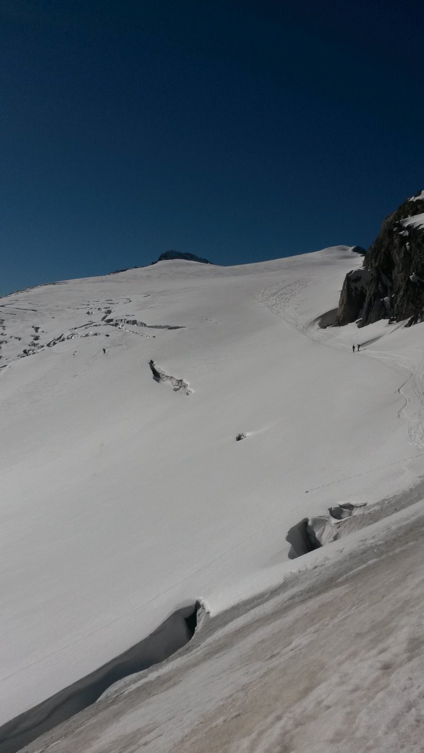 Beste Schneeverhältnisse, zum Teil gab es sogar noch ein paar Pulverschneeschwünge. Route war bereits perfekt gespurt und die wenigen Spalten sind gut sichtbar. Einzig nach der Schlüsselstelle (Felsriegel) auf den Gletscher ist kurz erhöhte Vorsicht geboten, dies bei der Abfahrt. Dort lauert doch eine unschöne Randspalte. Steigeisen sind für den Auf- und Abstieg allenfalls empfehlenswert.