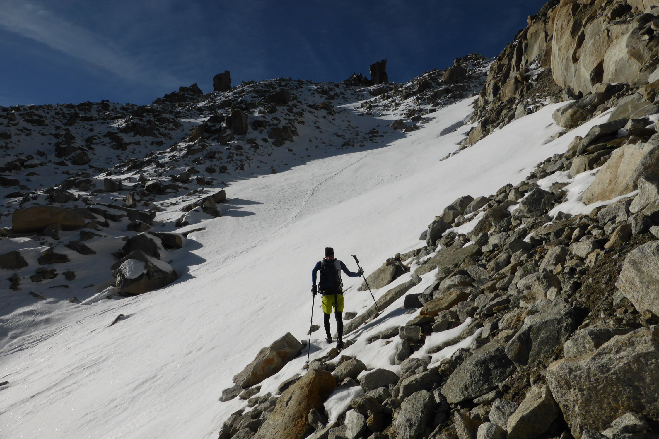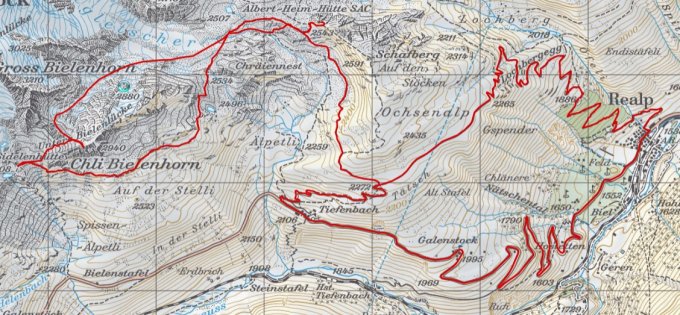 Aufstieg zum Chli Bielenhorn ist nun gespurt und der Nepali Highway hat nur an Schattenhängen noch Schnee ( blau - weiss )