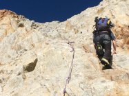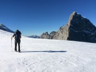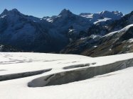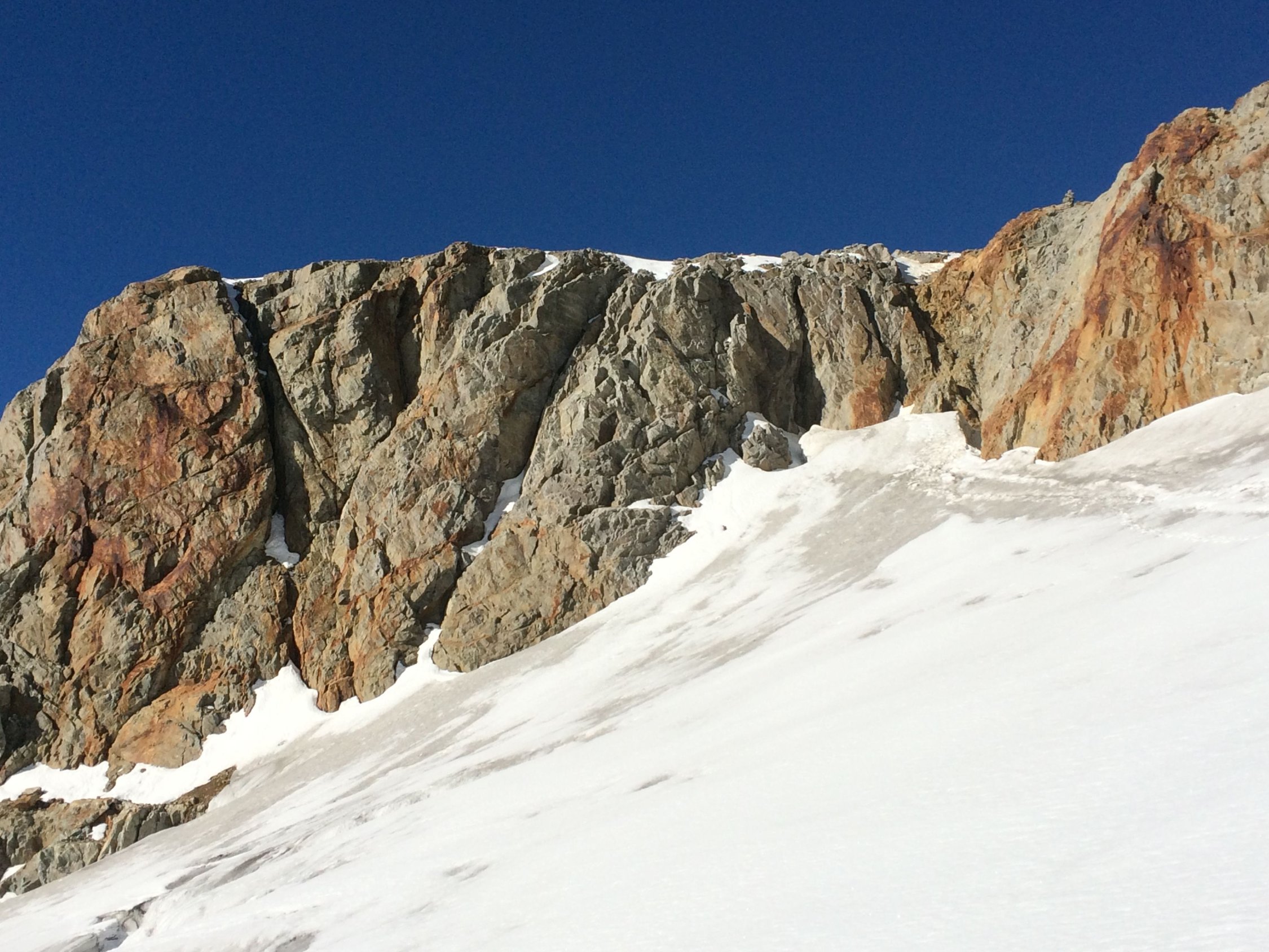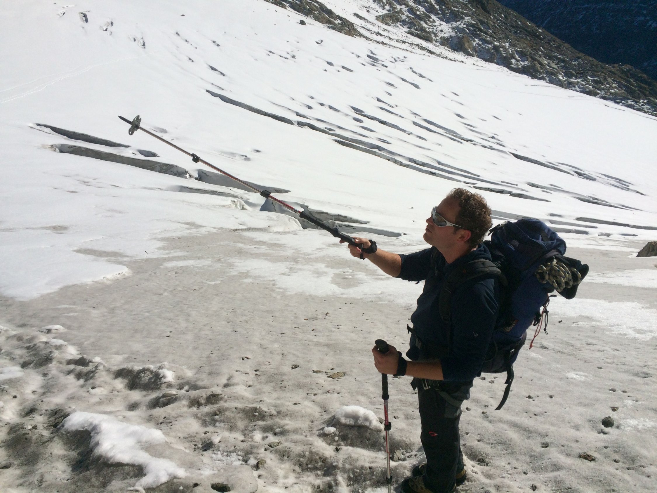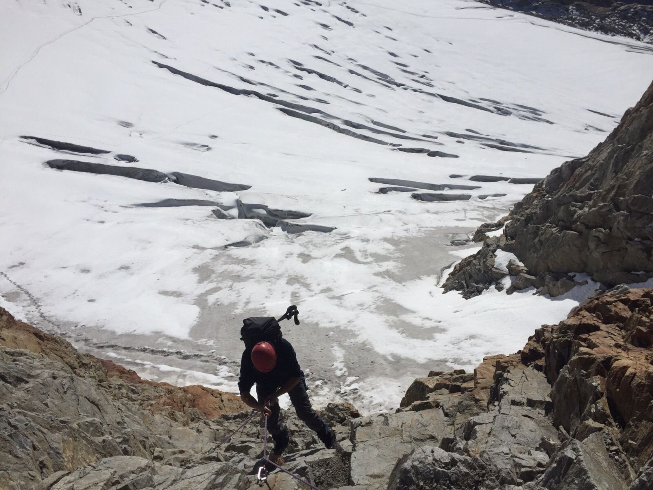 Der Stössenfirn ist ziemlich ausgeapert und die Spalten gut sichtbar. Die Felsstufe zum Joch ist mit einem Fixseil sehr gut gesichert. Wir brauchten weder Steigeisen noch zusätzliche Seile.