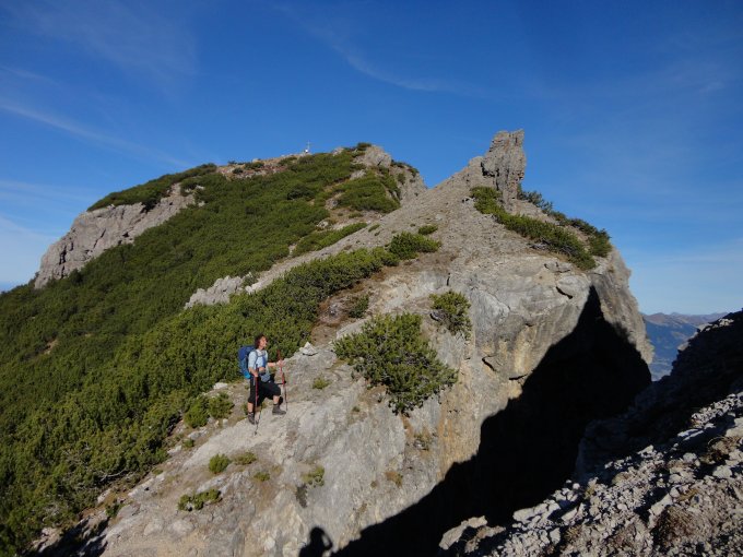 Bis auf den kurzen Abstecher zur Zäwasheilspitze und den Südgipfel der Hohen Köpfe alles markierte u. bez. Bergwege. Meist unschwierig, lediglich die nordostseitige Querung an den Hohen Köpfen erfordert etwas Trittsicherheit und Schwindelfreiheit. Ausgesetzte Passagen sind drahtseilgesichert, offensichtlich mit recht neuen und entgegen früheren Berichten einwandfreien Versicherungen. Der weglose Aufstieg zum südlichen Hohen Kopf zweigt in der Scharte vom Höhenweg ab und weist Trittspuren und vereinzelt Steinmänner auf. Wetter wie überall sonnig, sehr warm und nahezu windstill.