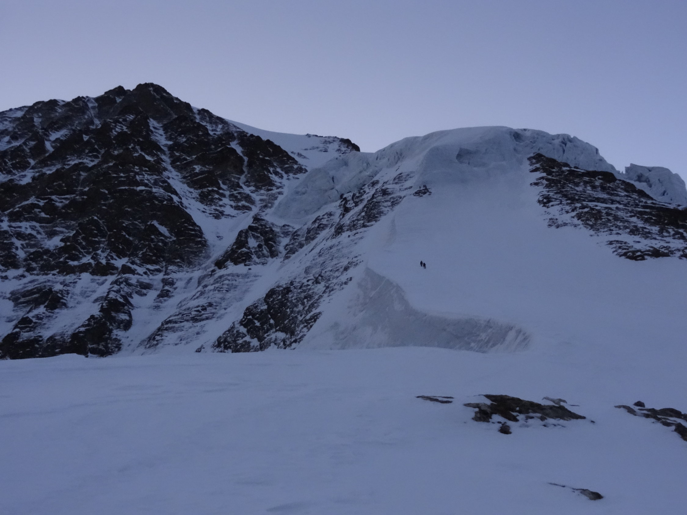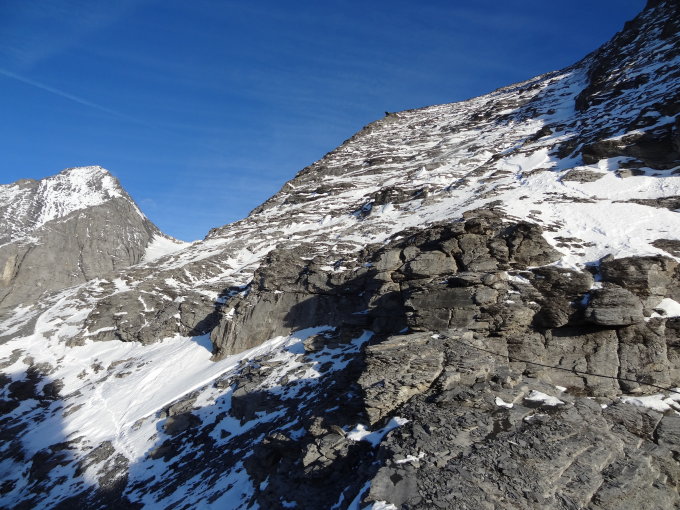 Top-Verhältnisse. Recht gute Scheeauflage durch die Bänder der Flanke zum Plateau. Danach bequemer Zustieg zum Nollen. Nur die letzten Meter vor dem Nollen Blankeis.