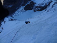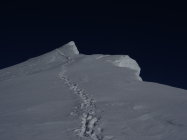 Nach dem etwas heiklen aber keineswegs problematischen Bergschrund in die Ausstiegswand hinein: perfekt gespurter Trittschnee. Die derzeitige Spur zieht leicht rechts auf den SW-Grat hin. Vom Grat aus unschwer zum Gipfel.