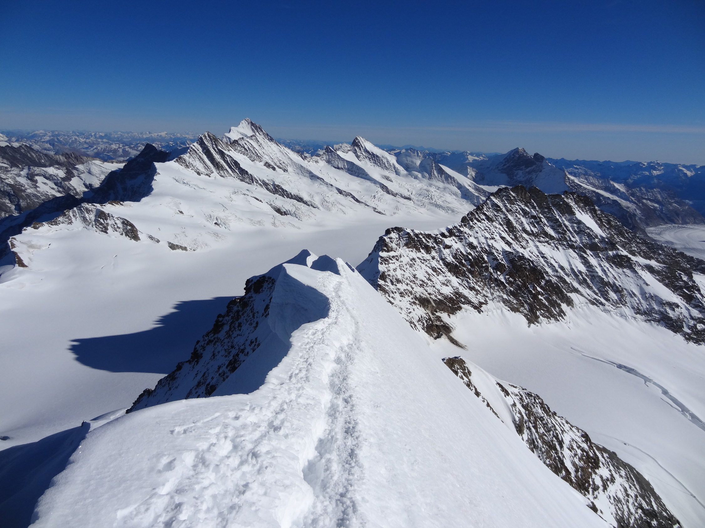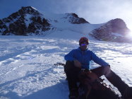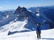 Abstieg Normalweg: direkt oben auf der Firnscheide gespurt und gut machbar. Durch die Sonneneinwirkung sind die südseitigen Spuren leicht unterhalb der Schneide nicht zu empfehlen.