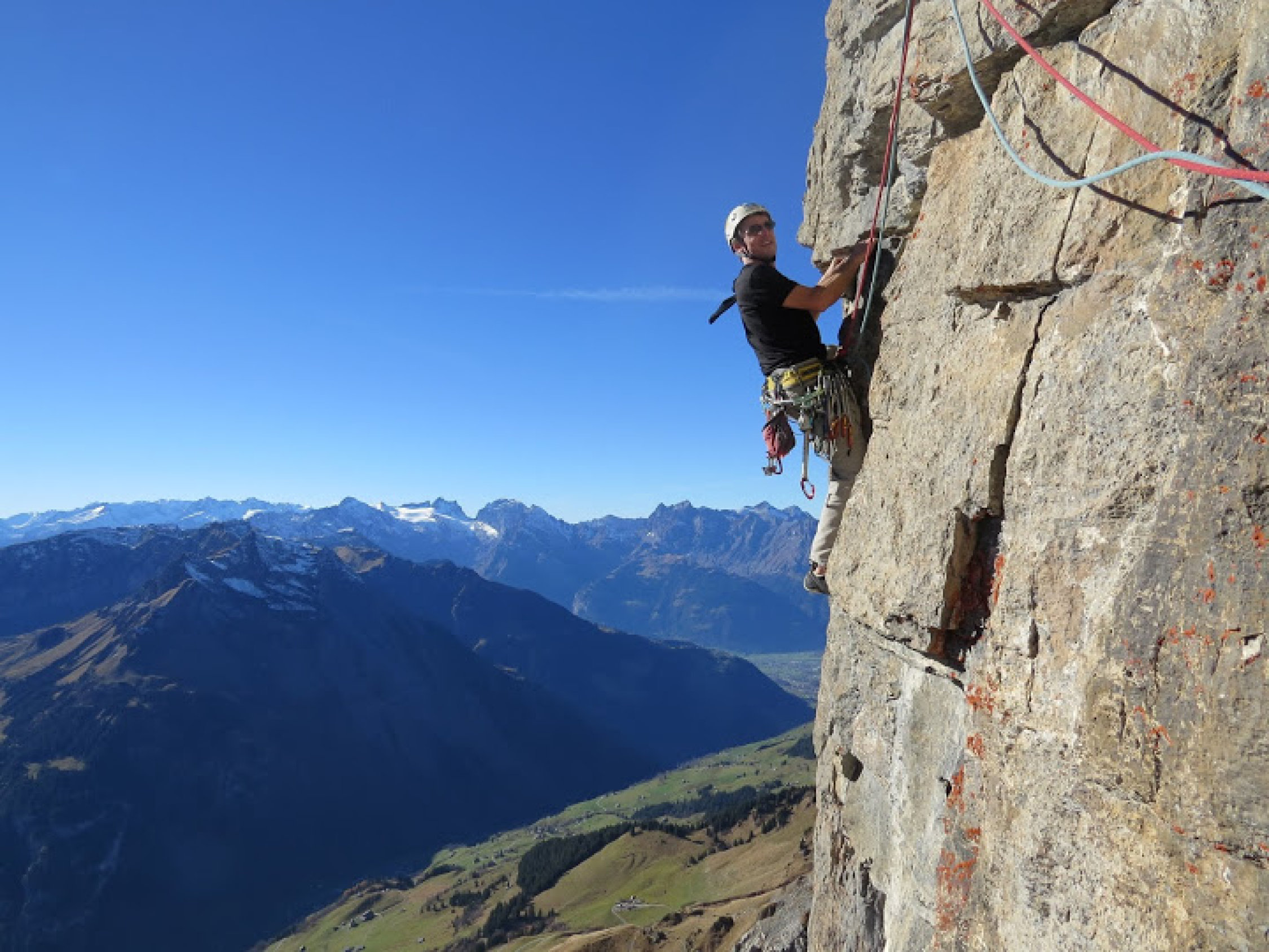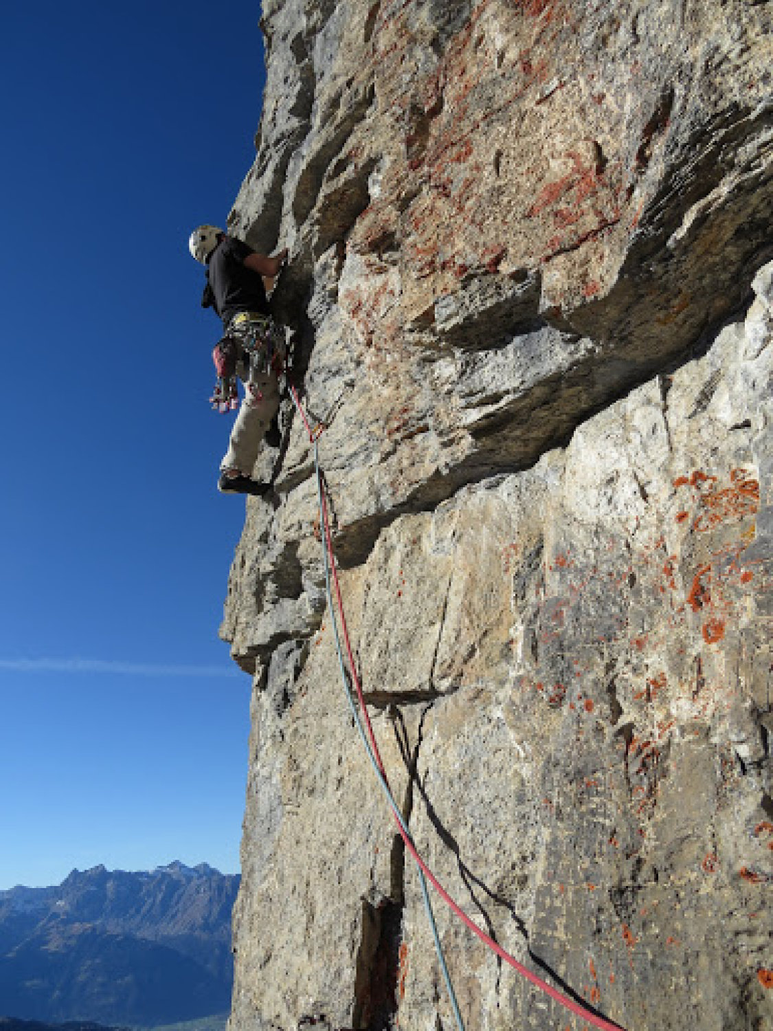 Abgesehen von der zweiten Hälfte der 1. SL, welche ich als potenziell gefährlich ansehe, da keine Haken und mobile Geräte nur an liederlichen Schuppen möglich, eine tolle Route. Obwohl nicht geklettert, wäre das 6c obli wohl in der 7a-Länge zu finden, nach dem Dächli der Aufsteher und nach li hinaus - oder jemand möge mich korrigieren...