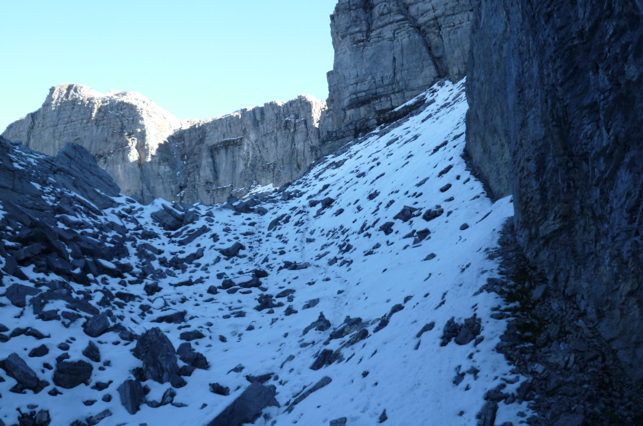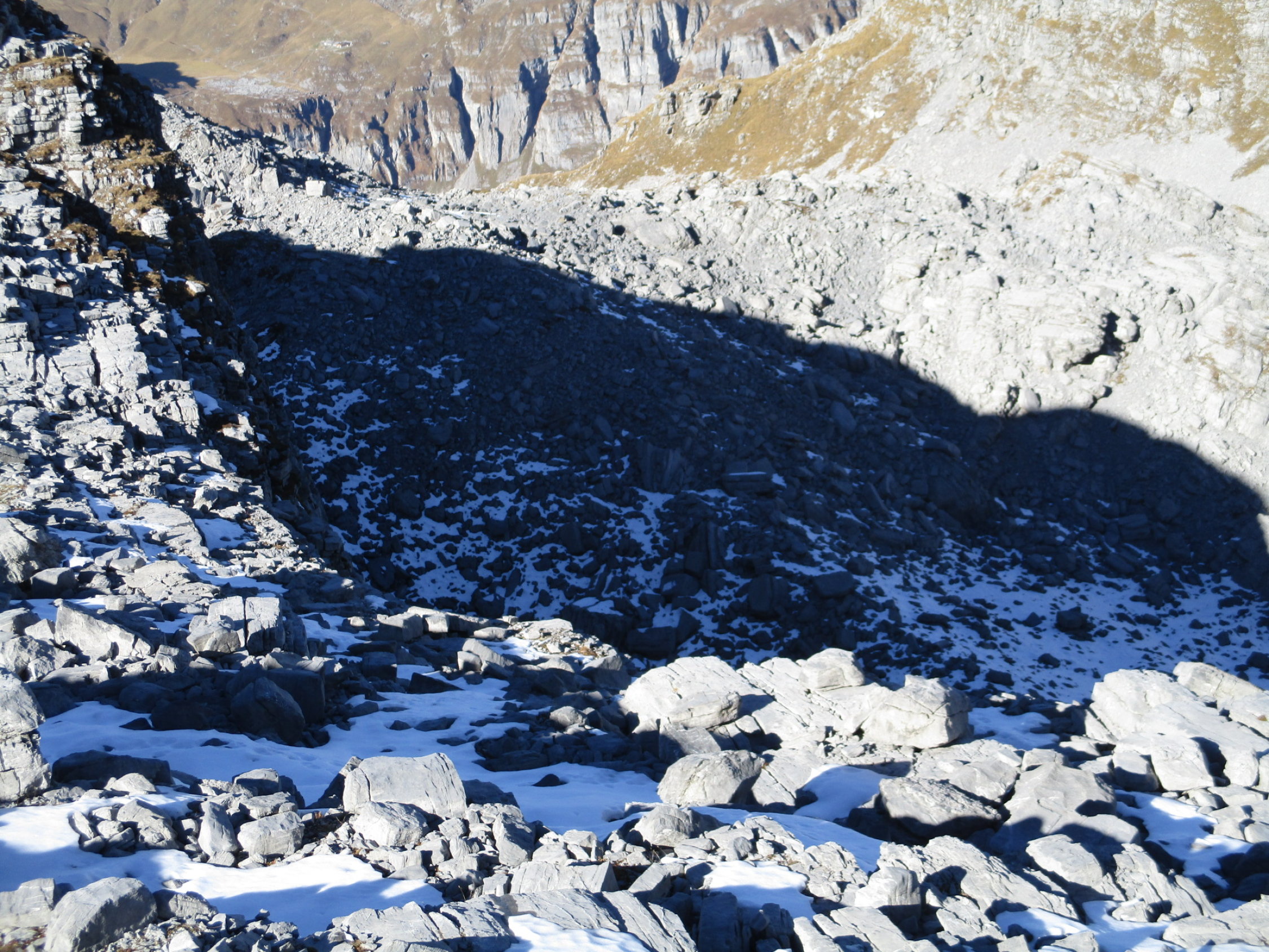 Aufstieg bis zum erwähnten ersten Plateau alles im Schatten. Das Pink markierte Weglein hinter dem Chli Glatten ist vereist. Hochfläche des Glatten trocken und schneefrei