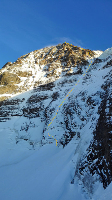 Haston-Eistrup Couloir mit direktem Einstieg im Mixed Gelände und Ausstieg durch den schmalen Eisschlauch mit Eisfall.