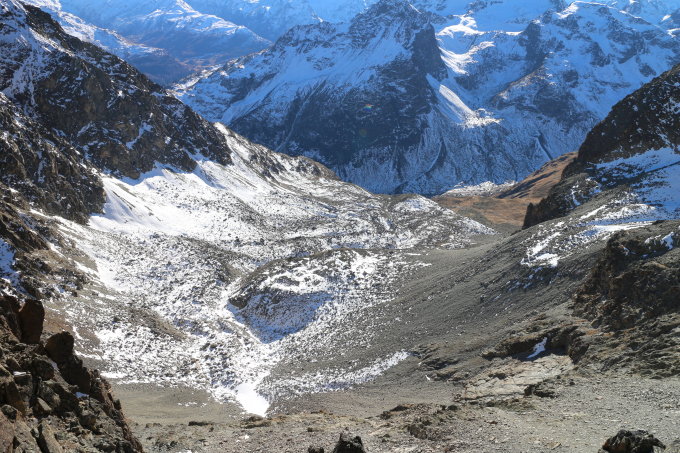 Im unteren Teil muss über Schneefelder gequert werden, aber die Blöcke sind trocken.