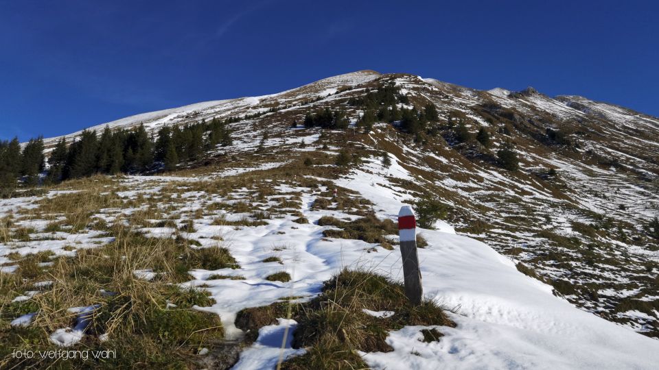 Der Weg vom kostenlosen Parkplatz der Talstation Fell, bei Oberrickenbach auf 903m, richtung Haldigrat / Brisen über Ober Spis 1’196m und Haghütte 1’507m, bis Widderen P1721, ist meist nass, teils etwas rutschig und ab 1’600m schneebedeckt. Ein Wegweiser bei P1721 links weg richtung Haldigrat / Brisen, ist nicht vorhanden, oder wurde im Winter demontiert. Der weiss-rot-weiss markierte Bergweg quer durch die Südwestflanke, hoch zum Grat der Windegg ist eingeschneit, früh morgens bei gutem Trittschnee, während der Zickzackweg hoch zum Haldigrat abwechslungsweise schneefrei, oder teils mit Bruchharsch knietief eingeschneit ist. Lawinengefahr besteht nicht, diese sind grossflächig, links neben dem markierten Bergweg im Steilgras abgerutscht. Die Querung ab 2’160m zum Haldigrat links durch die Südwestflanke ist eingeschneit und ab der Hälfte auch eisig. Ich habe die Querung in der Hälfte abgebrochen und bin weiter über Steilgras, mehr oder weniger schneefrei, direkt zum markierten Bergweg am Haldigrat hochgestiegen. Der Bergweg führt mehrmals eingeschneit in die steile Südflanke und es sind auch Schneerutschnungen erkennbar. Ab 2’300m geht man sicherer direkt am Grat, teils durch knietiefen Schnee und am Gipfelaufbau in leichter Kletterei in meist schneefreien, gut griffigen Felsen. Mit Bedacht und entsprechender Vorsicht ist das gut und sicher machbar, auch wenn es von weitem nicht so aussieht. Steigeisen hatte ich dabei, brauchte sie alledings nicht, ein Pickel wäre jedoch hilfreich gewesen.