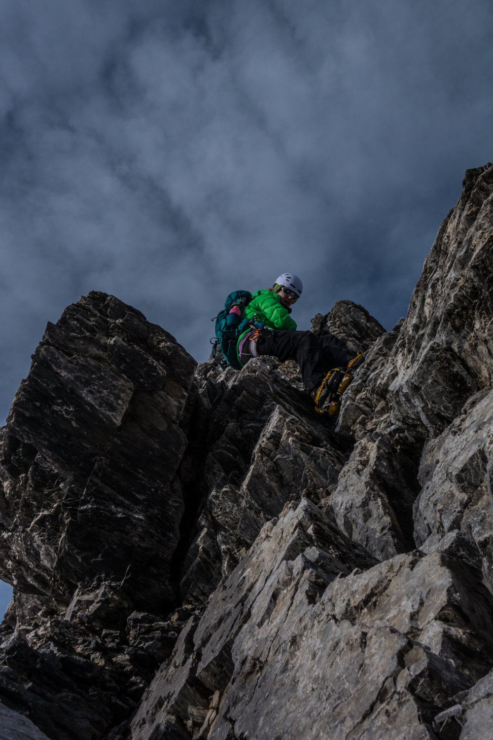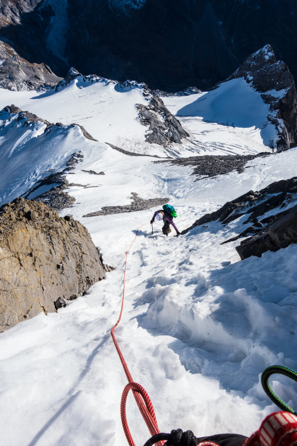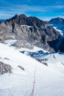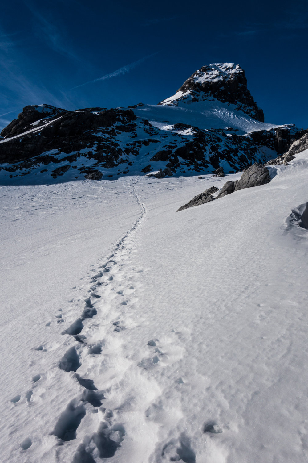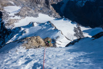 Im Gipfelaufbau erstes coulouir mit guter Schneefüllung, reduziert den Steinschlag erheblich. Im oberen Teil gute Spur, Felspartien Südseitig Knochentrocken.