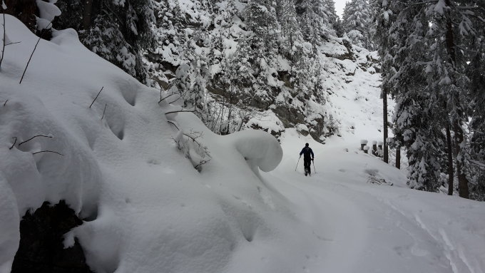 Es konnte bis auf den Gipfel gespurt werden und wir konnten auch direkt von diesem Richtung Chelli abfahren. Im obereren Teil muss man vorsichtig fahren, einzelne grössere Steinblöcke sind nicht gut eingeschneit. Trotzdem hatten wir kaum Bodenkontakt, die Schneedecke war erstaunlich gut tragend. Durch das Chelli konnten wir es dann in traumhaftem Powder richtig fliegen lassen. Wenn wir in der Würzi nicht die direkte Abfahrtvariante gewählt hätten, dann wären wir mit nur mit ein paar geringen Steinkontakten wieder im Tal angekommen. Aber eben, wir hatten halt unsere Steinskis dabei... Auf der Strasse abfahren geht problemlos und ohne Bodenkontakt.