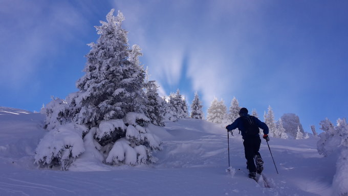 Mit ca. 50cm liegt genug Schnee, um die Tour problemlos ab Parkplatz Senggiweid zu starten. Der Schnee ist bis auf Höhe Alpetli noch wenig gebunden und man kann relativ einfach mit dem Skistock bis auf den Grund durchdringen. Beim Spuren sinkt man zwar deutlich ein, trotzdem ist die Schneeschicht gut tragend und je höher man steigt, umso höher wird auch die Schneedecke. Ab der Alphütte (P 1794) und über den ganzen Rücken hoch zum Mariannehubel hat der Wind deutliche Spuren hinterlassen. Der Schnee ist mehrheitlich windgepresst oder liegt in pulveriger Form in den Mulden. Stellenweise ist der Schnee bis auf den Grund weggeblasen. Eine Abfahrt via Aufstiegroute ist nur bedingt empfehlenswert.