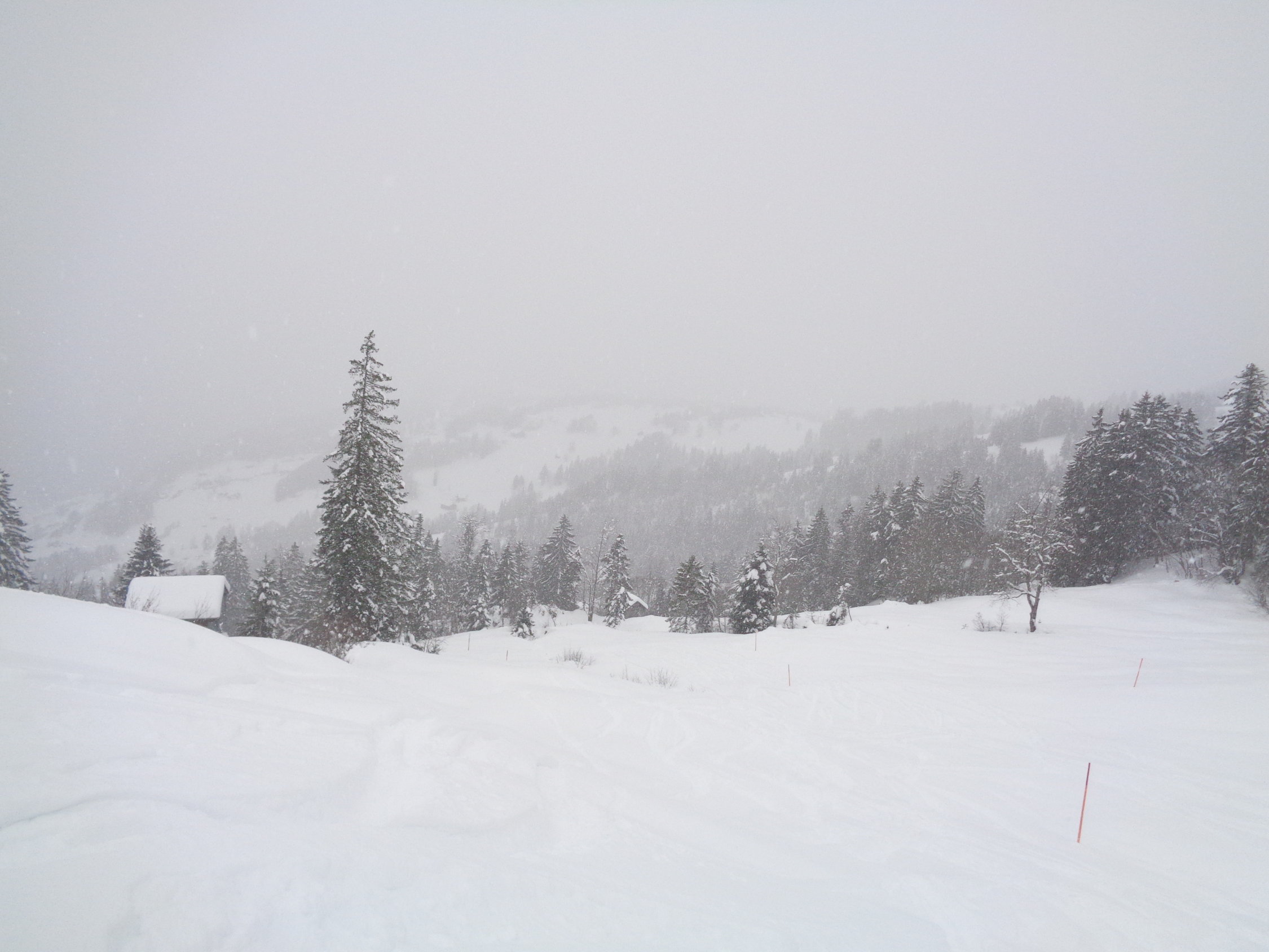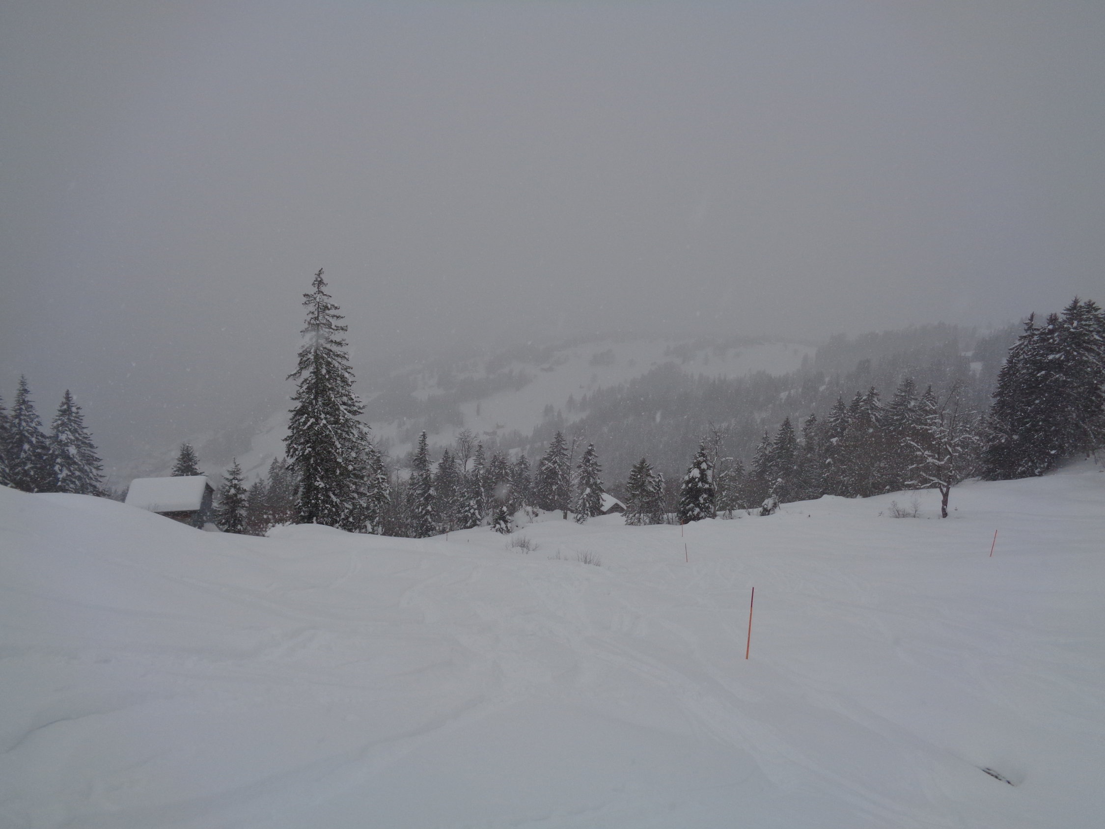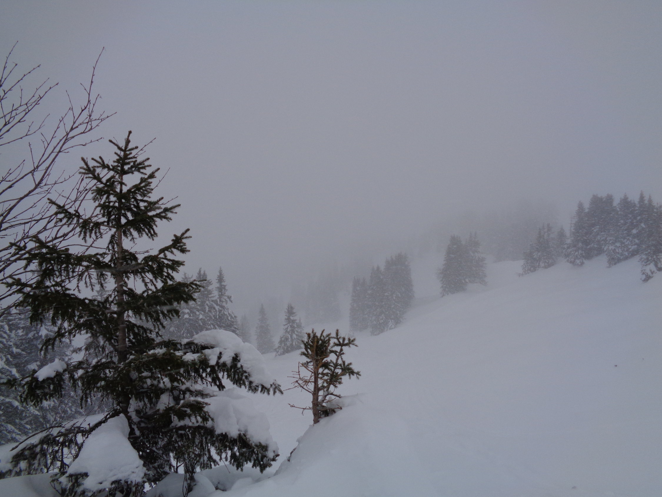 Leichter Schneefall am Gipfelhang frischer Wind, wenig los und viel Schnee. Im untersten Bereich mit ganz leichtem Deckel, ansonsten Powder ohne Ende. Mehr als ausreichend Schnee, im oberen Bereich ca. 60-100 cm. Breite Skis von Vorteil.