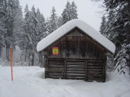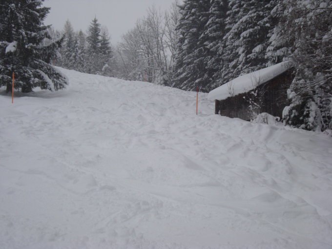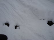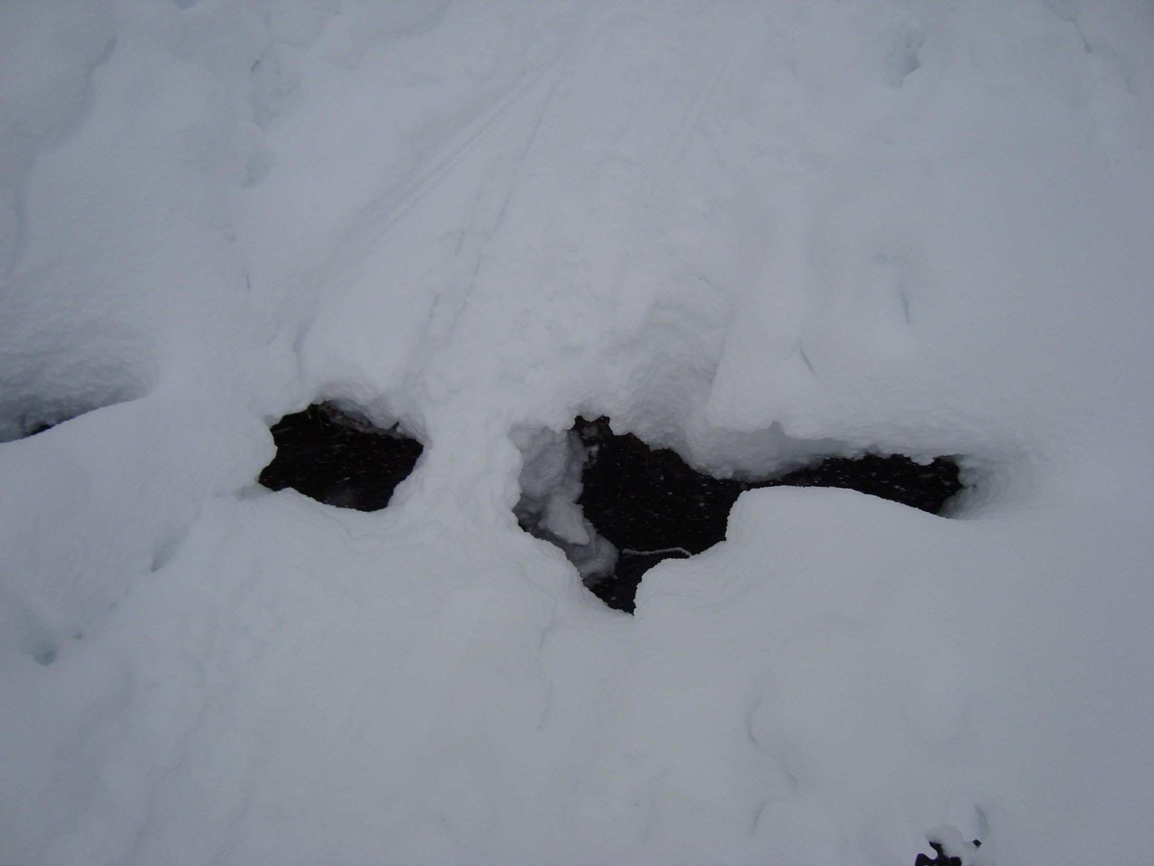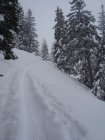 Die Tour ist von Beginn an schon sehr gut eingeschneit. Das erste Steilstück ist schon recht fest- und ausgefahren. In den weitläufigeren Abschnitten fehlt noch die tragende Unterlage. Auf Grund des schweren Pulvers spielt dies aber kaum eine Rolle, es lässt sich auch in den flacheren Stücken gut dahingleiten. Einzig die noch zum Teil geöffneten Bachläufe, vor allem bei einer etwas diffusen Sicht wie heute, erfordern erhöhte Aufmerksamkeit in der Abfahrt.