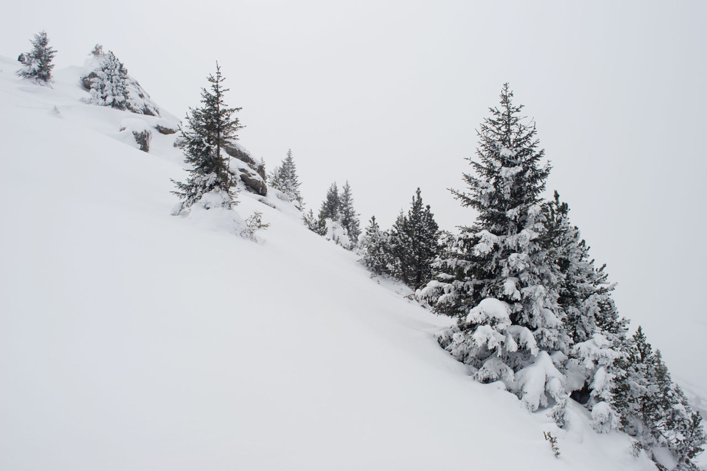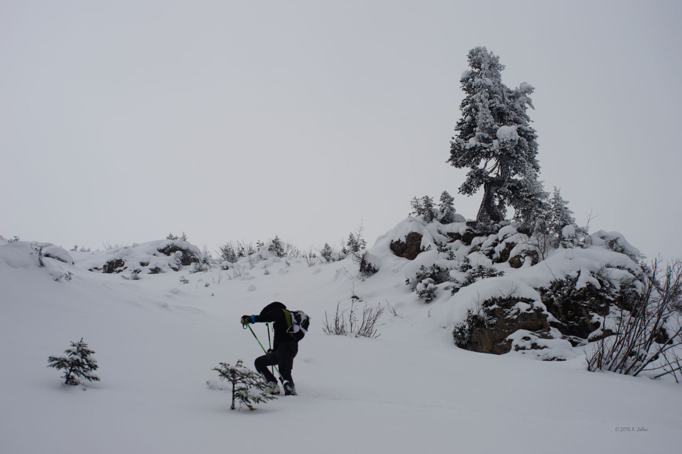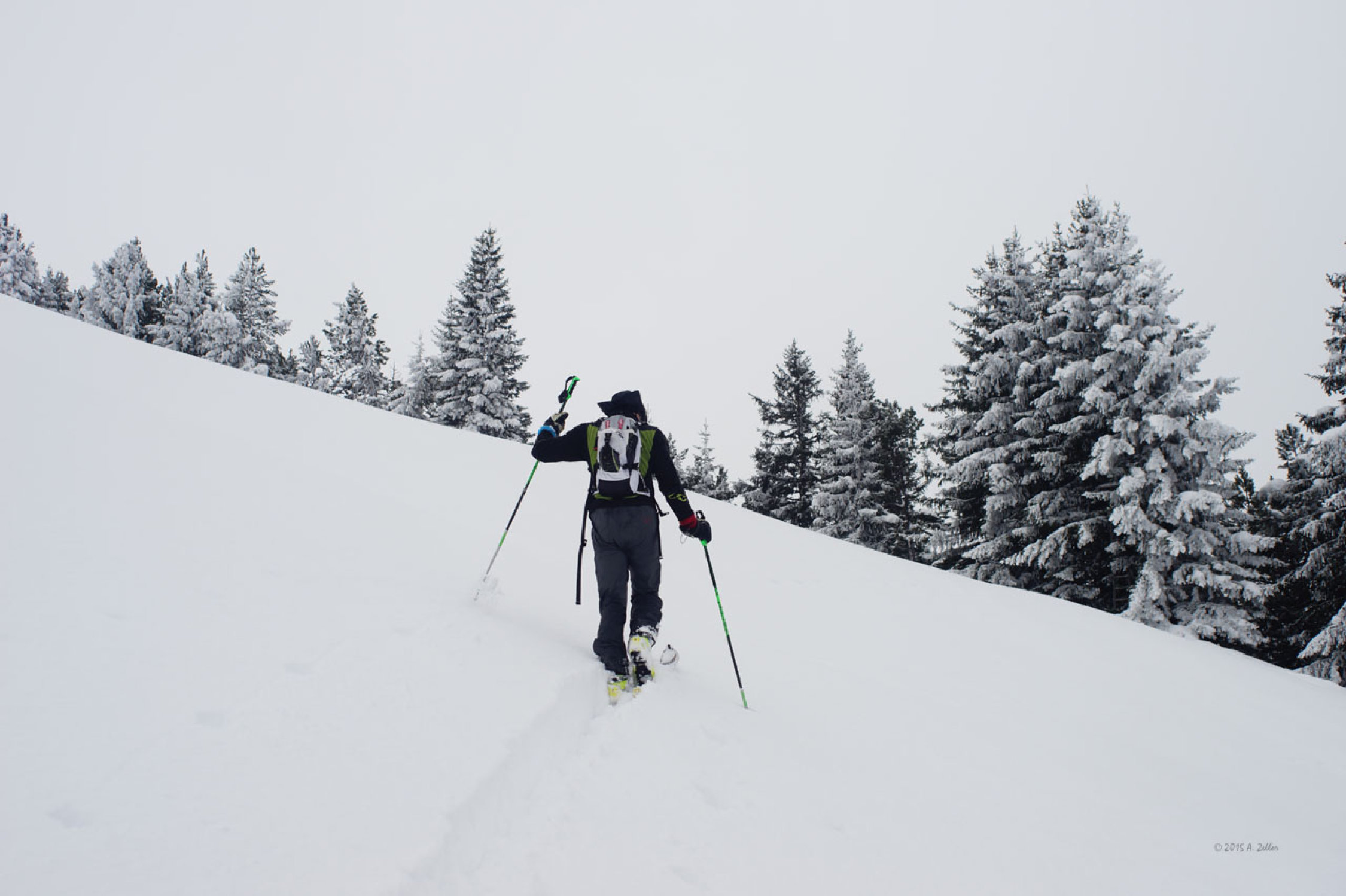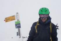 Bedeckt, leichter Schneefall, -1°C beim Start, Gipfel -1°C, Rückkehr +1°C. Leichter Westwind. I Aufstieg auf 1800m kurz leichter Nieselregen (Okklusion). In der Abfahrt Aufhellungen.