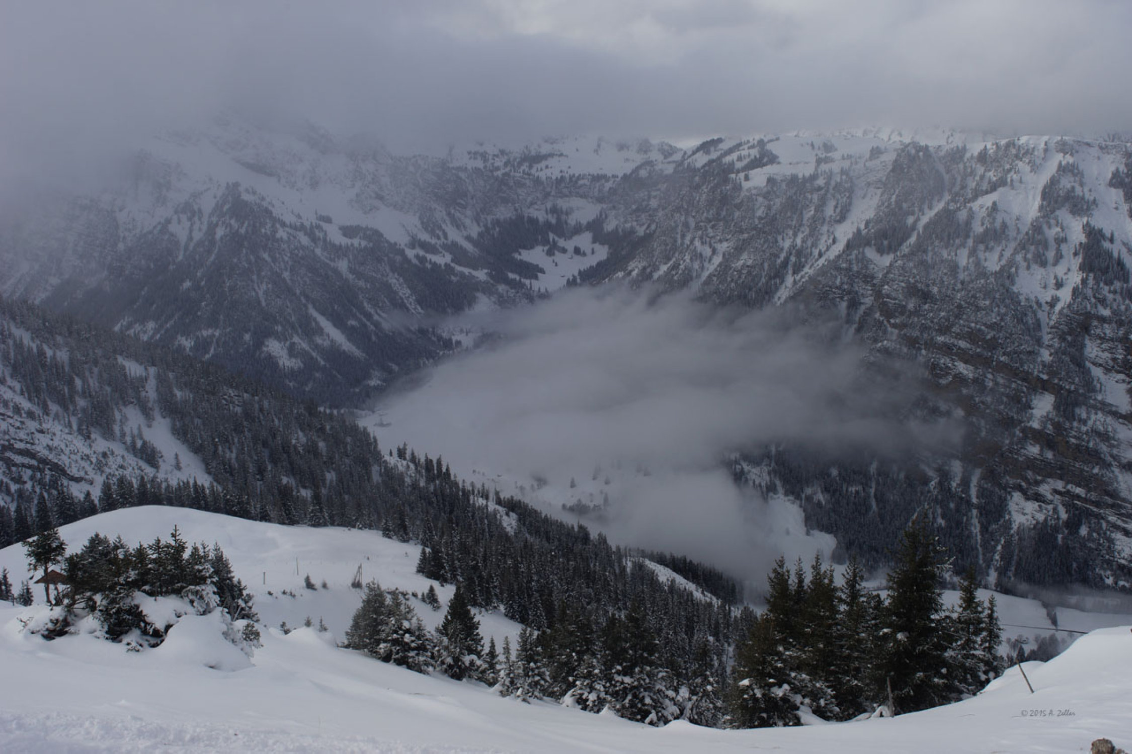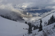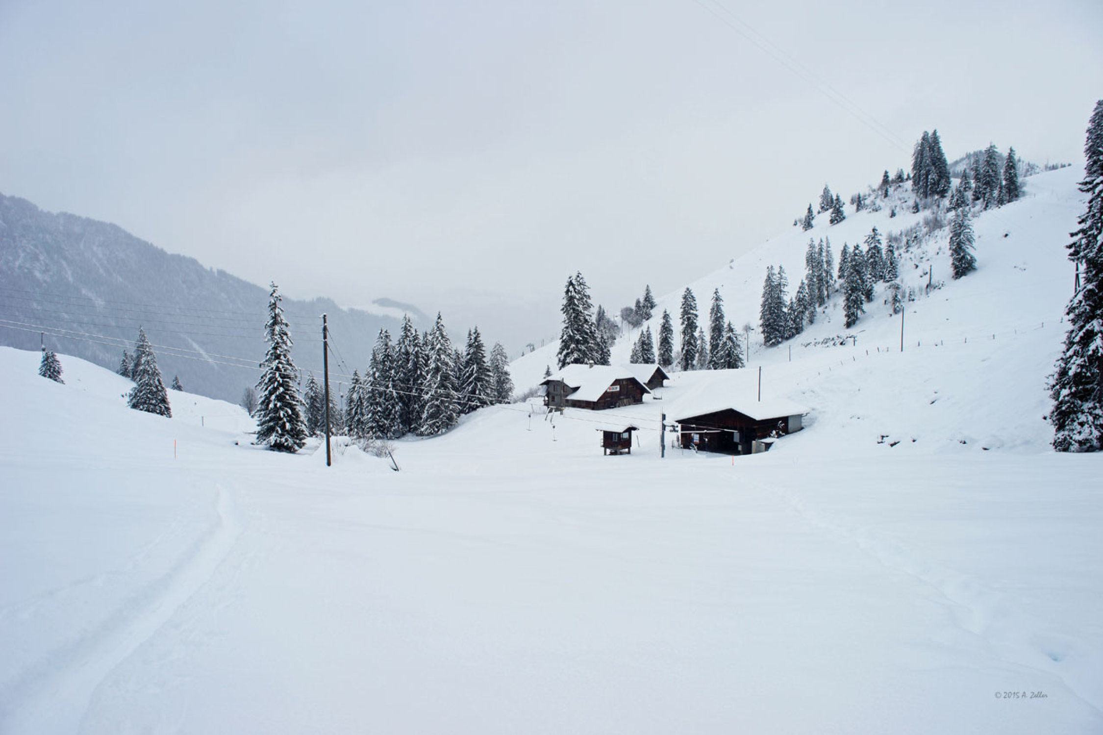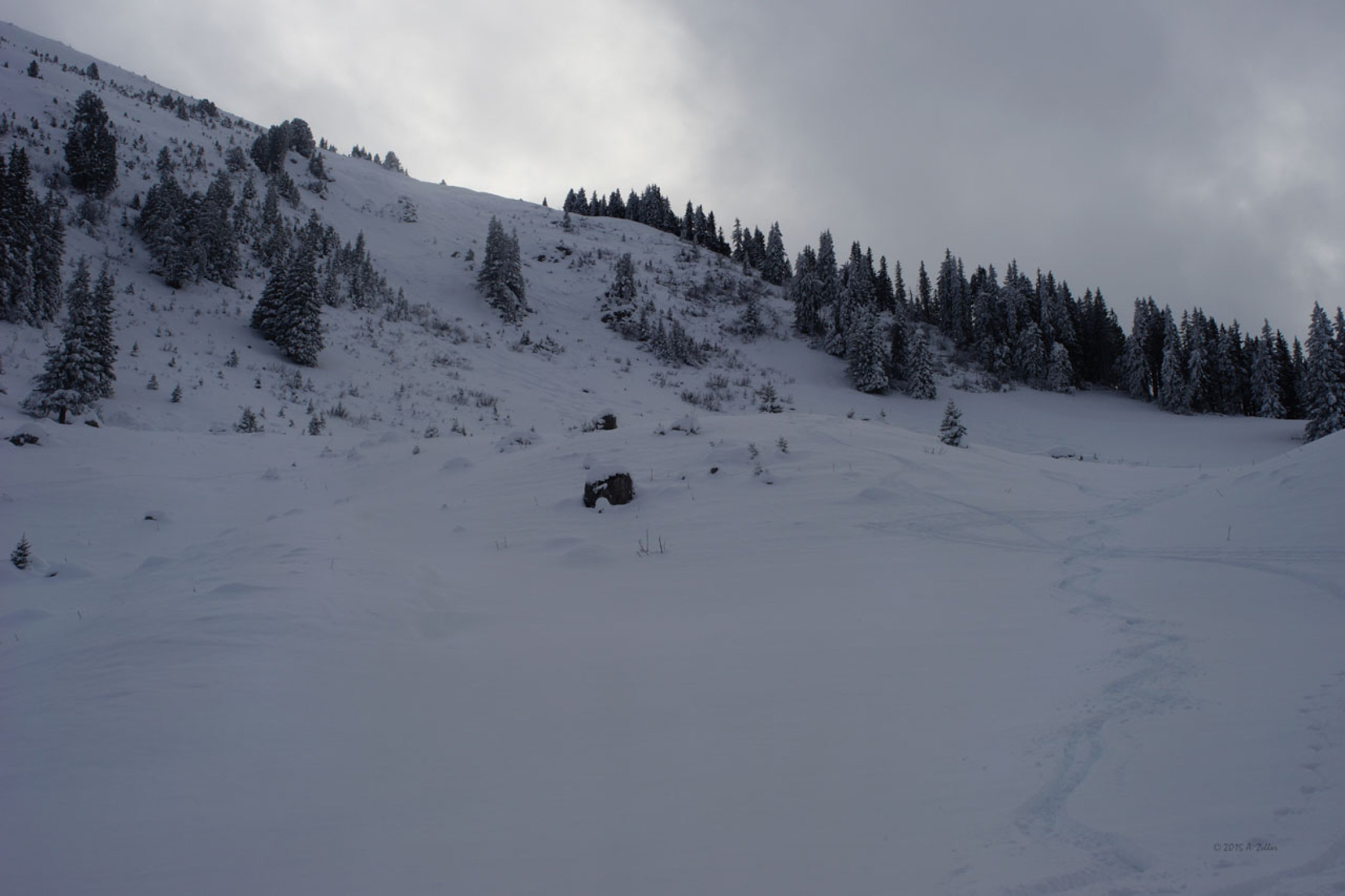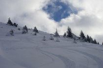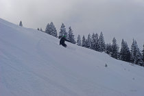 Die Skianlagen Wiriehorn haben noch nicht eröffnet, Pisten sind noch nicht präpariert. Daher noch wenig verfahrener Tiefschnee auf den Pisten.