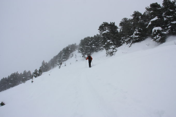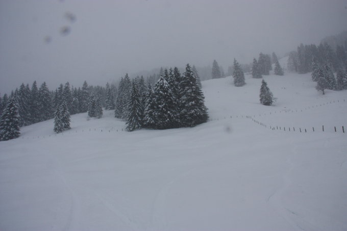 leichter Schneefall, wolkig, im Mittelteil starker Wind. Etwa 40 cm Neuschnee (Pulver). Neuschnee ohne Bindung.