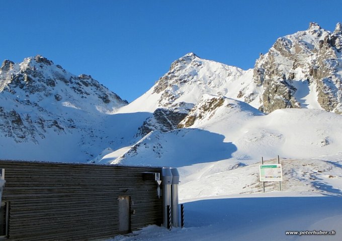 Von dort haben wir gegen den Pizolglescher geschaut - ab dem See ist der Schnee stark verweht. Viele Steine schauen heraus. Gletscherteil scheint OK. Für den Aufstieg wäre eine passable Spur möglich. Doch für die Abfahrt schien uns das zu mager. So stiegen wir noch zu Fuss zu den Schwarzen Hörnern 2643 m auf und genossen die schöne Rundsicht.
