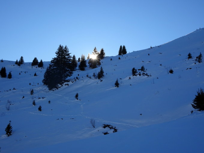 Wunderbares, angenehmes Wetter. Im Schatten hat der Schnee bereits einen Deckel bekommen, was mühsam ist zum spuren. Möchte den zwei Schneeschuhläufern die (gestern?) gespurt haben, danken. Ich hätte sonst recht beissen müssen. Zum Skifahren ist, trotz dem Enthusiasmus und der Vorfreude, eher ungünstig.