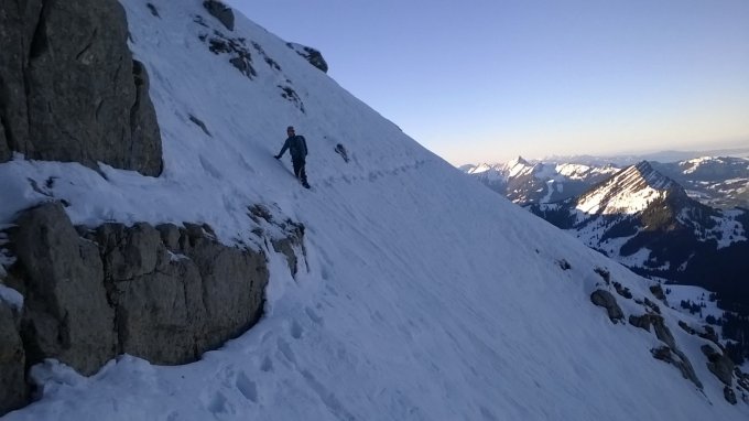 Der Weiterweg von den Silberplatten zur Tierwis quert einige steile Südhänge (Lawinengefahr beachten) und war angesichts des fortgeschrittenen Tages schon recht aufgeweicht.