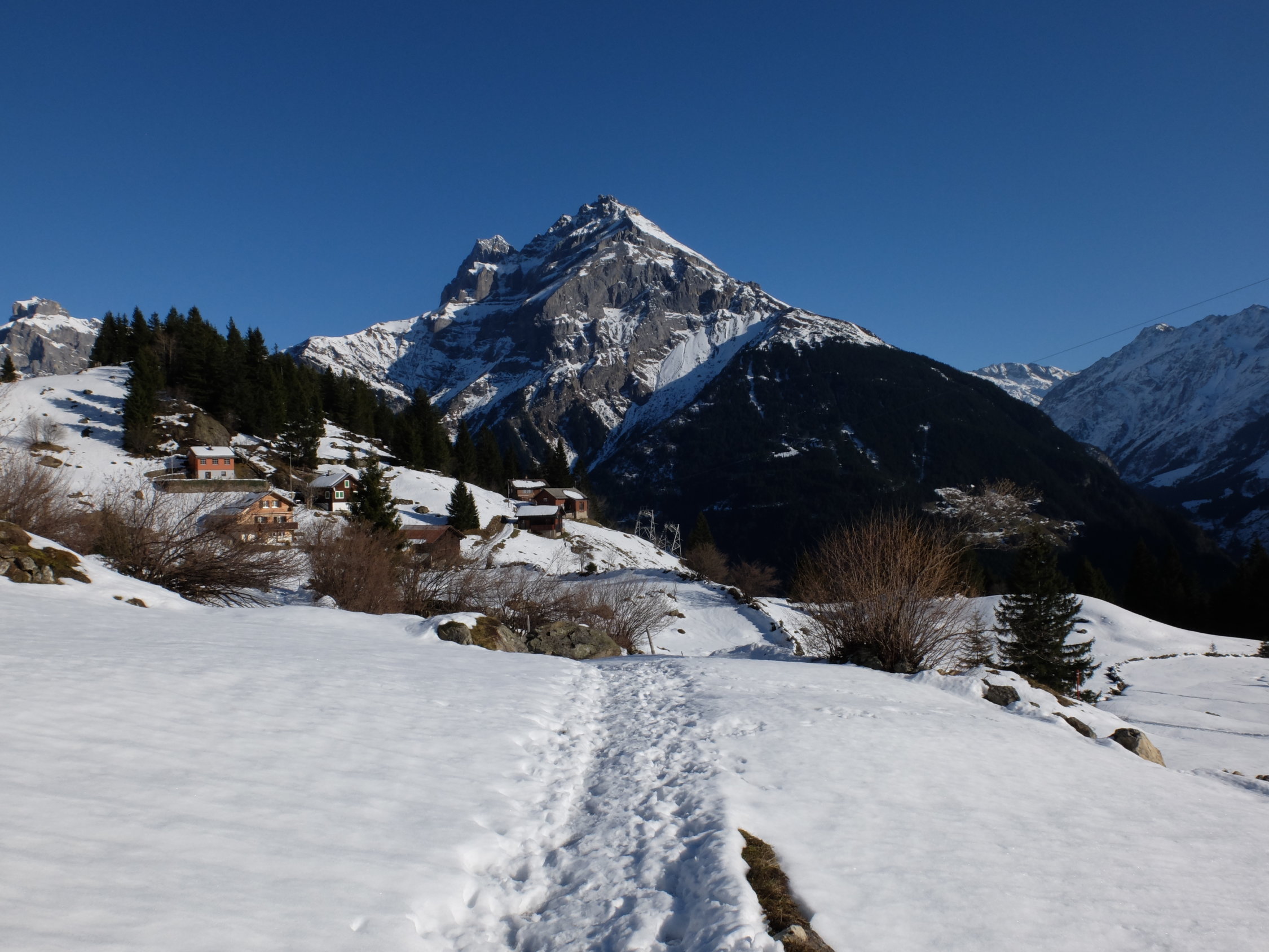 Die ganze Tour haben wir Skispuren von Samstag (5.12.) verfolgt, siehe Eintrag http://gipfelbuch.ch/gipfelbuch/detail/id/76770/Skitour_Snowboardtour/Kroenten. Ab Arnisee (Wald meidend) war der Aufstieg gut möglich. Die Abfahrt wäre hier bis Furt (1750m) in Ordnung, die darunterliegende Stufe (um 1720m) war für Skiabfahrt wenig tauglich. Oberhalb von Kröntenlücke gab es für Skier nur bedingt viel Nutzen, nur ein paar Kurven konnte man setzen. Abfahrt vom Sasspass sowie auch über Hintere Steinchelen mit guten Bedingungen. Skiabfahrt möglich bis zur Waldgrenze (1300m).