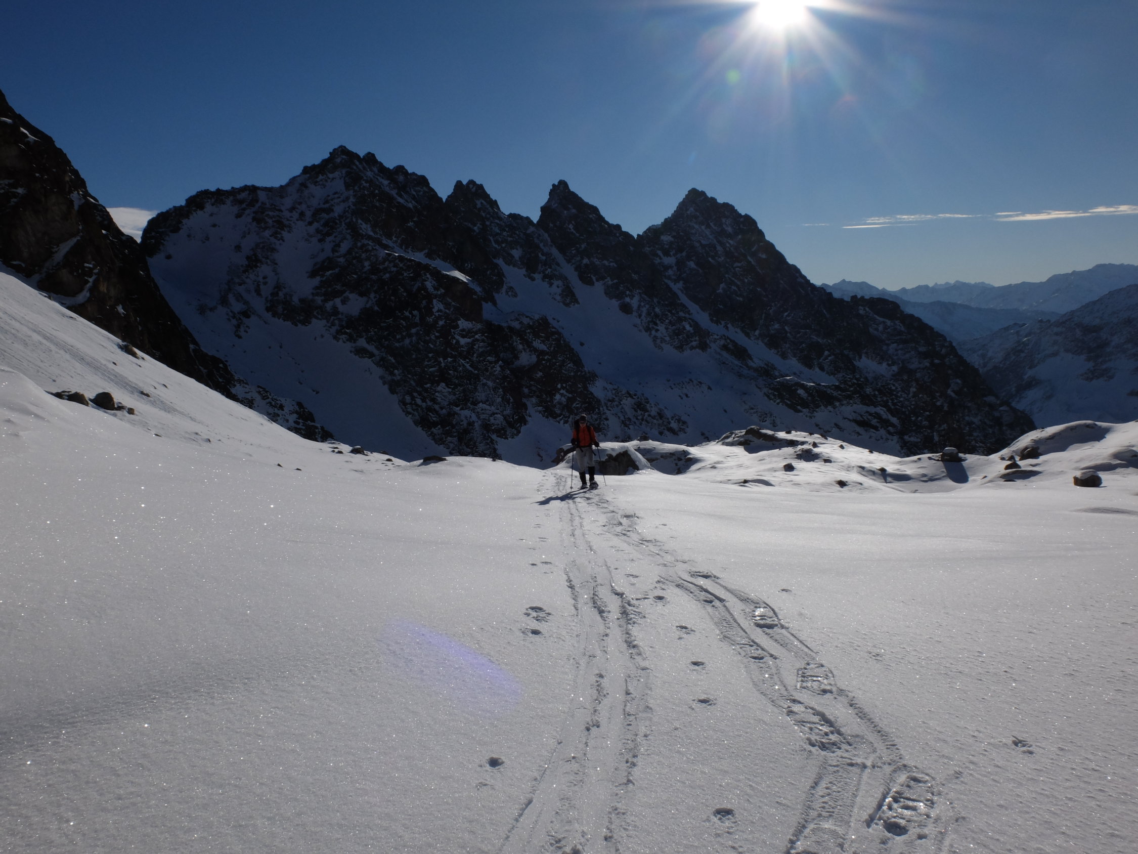 Wir waren mit Schneeschuhen unterwegs und die Tour haben wir auf 2 Tage geteilt, mit Übernachtung im Winterraum von Leutschachhütte. Derzeit ist die Tour mit Schneeschuhen gut machbar, oberhalb von 2750m sind wir ohne Schneeschuhe gegangen (Steigeisen waren auch nicht nötig). Auf dem Sassfirn gibt´s tragende Oberfläche. Auf dem Westgrat liegt nur wenig Schnee und der südliche Aufschwung auf den westlichen Turm ist aper. Den Abstieg wählten wir über Gorneren, wohin wir durch Hintere Steinchelen abstiegen (ohne Schneeschuhe).