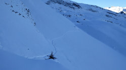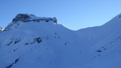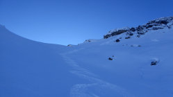 Die Abfahrt dann bis zum Chüestein schneetechnisch ein Traum - Pulver pur, alles first line. Skitechnisch muss jedoch sehr verhalten gefahren werden, da dem stiebenden Schnee oft die Unterlage fehlt und folgedessen Steinkontakte für böse Überraschungen sorgen können. Ich selbst hatte Glück, aber wie gesagt, ich fuhr entsprechend auch defensiv. Wer meinen Spur folgt wird sich übrigens nicht auf der in der Skitourenkarte eingezeichneten Route befinden - diese Variante eignet sich für Steilliebhaber, welchen es auch einmal nichts ausmacht, ein wenig Skisafari zu erleben. Weiter rechts ist übrigens Wildschutzzone - bitte entsprechend beachten.