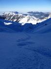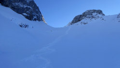 Das Gebiet präsentierte sich absolut jungfräulich und ruhig (08.00 Uhr Bähnli, schade Belrob, habe Dich um eine 1/2h verpasst), entsprechend wurde mir die Spurehre zu teil. Weil ich nicht sicherh war, ob ich zuerst noch den Chronenstock besuche, spurte ich entsprechend auch so. Der Blick hoch zum Chaisertor (Nord-Rampe) versprach ein Pulverparadis der besten Sorte, entsprechend konnte ich dieser Versuchung nicht widerstehen und spurte in diese Richtung und genoss anschl. eine fantastische, stiebende Abfahrt. Folgedessen liess ich den Chronenstock aus - der wäre somit noch jungfräulich und die Aufstiegsmulde sowie auch die Abfahrtsvariante "nord" lassen definitiv keine Wünsche offen --> ran an den Speck!