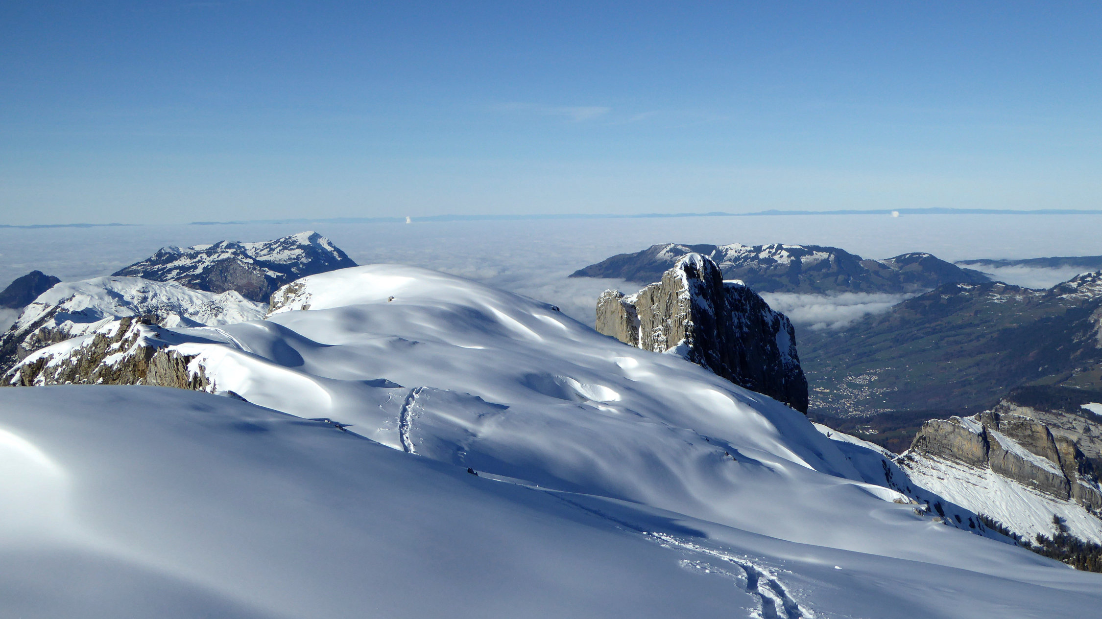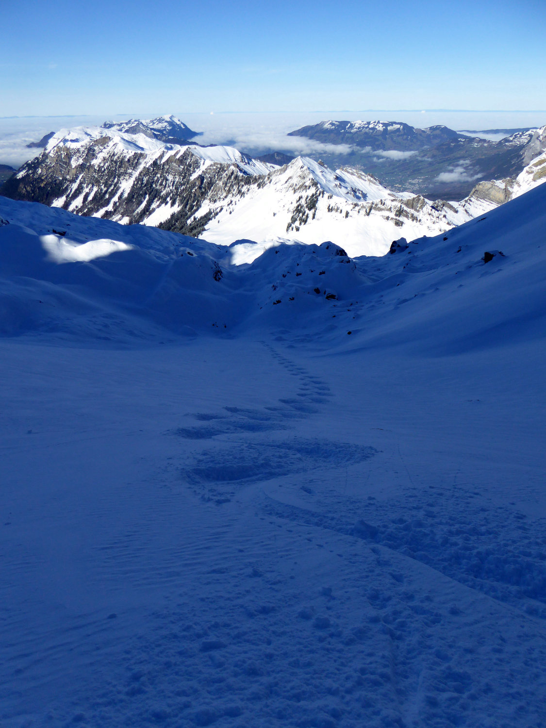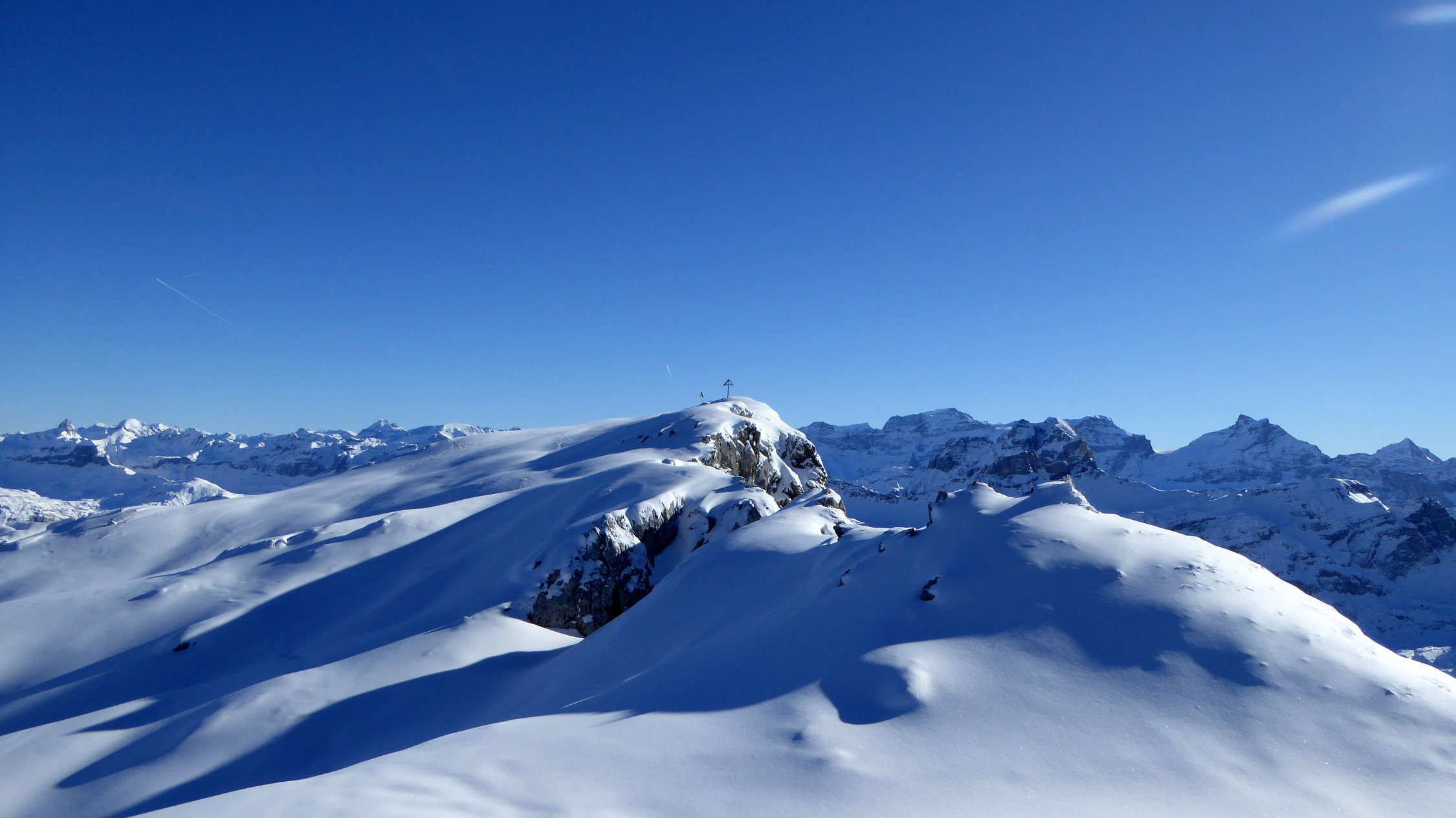 Ich zog weiter richtung Blüemberg und auch dort bei der Blüemberg-Mulde konnte ich dieser traumhaften Versuchung ebenfalls nicht widerstehen. Alles runter - ein absoluter Traum. Anschliessend in meiner eigenen, jedoch vom leichten Wind bereits wieder zugewehten Spur hoch, kurz vor dem Fussaufstieg (Stangen und Seile liegen frei) die Skis an den Rucksack und dank den Seilen hoch zum Plateau. Es empfiehlt sich dort nochmals die Skis anzuschnallen, versteckte Löcher warten nur darauf, Besuch zu bekommen... Endlich an der Sonne, entsprechend genoss ich mutterseelenallein den Gipfel. Später kamen noch 2 weitere Ski- / Splitboarder hoch - Gruss an Euch.