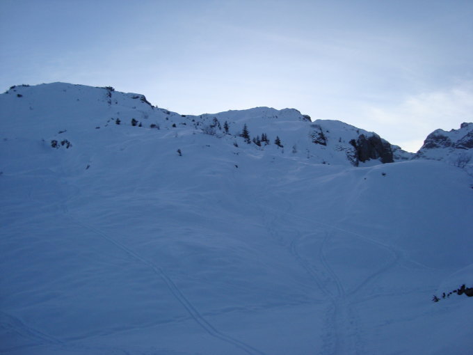 Schöner Pulver in steilen Rinnen (Anm.: kl. Gegenanstieg kurz vor der Alp).